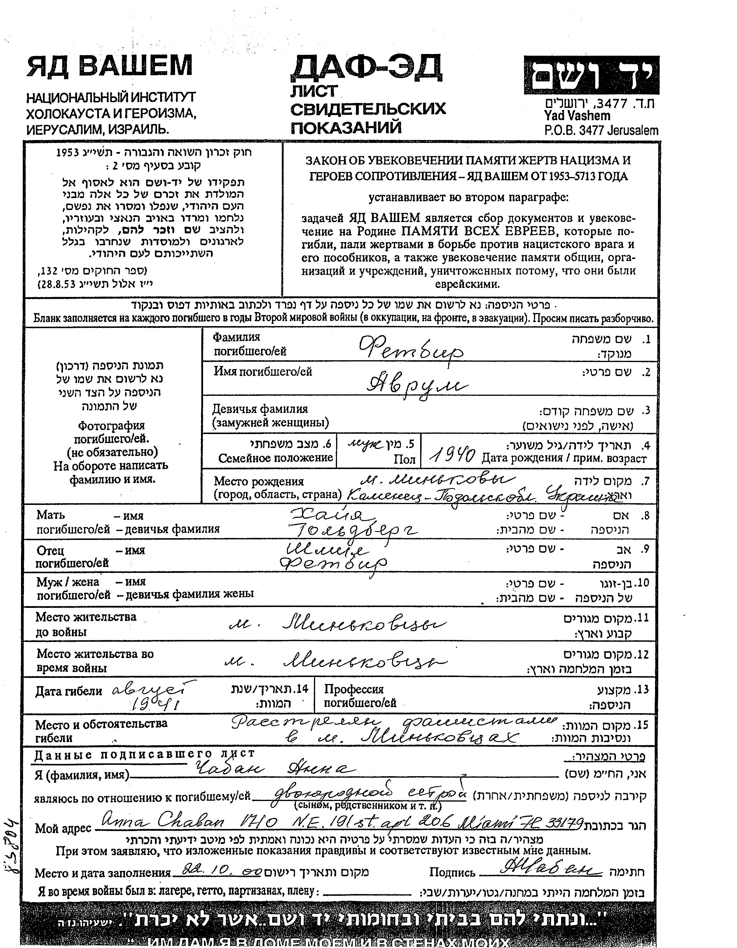 Фетбир Аврум 1940 Минковцы, Украина (СССР) Лист свидетельских показаний