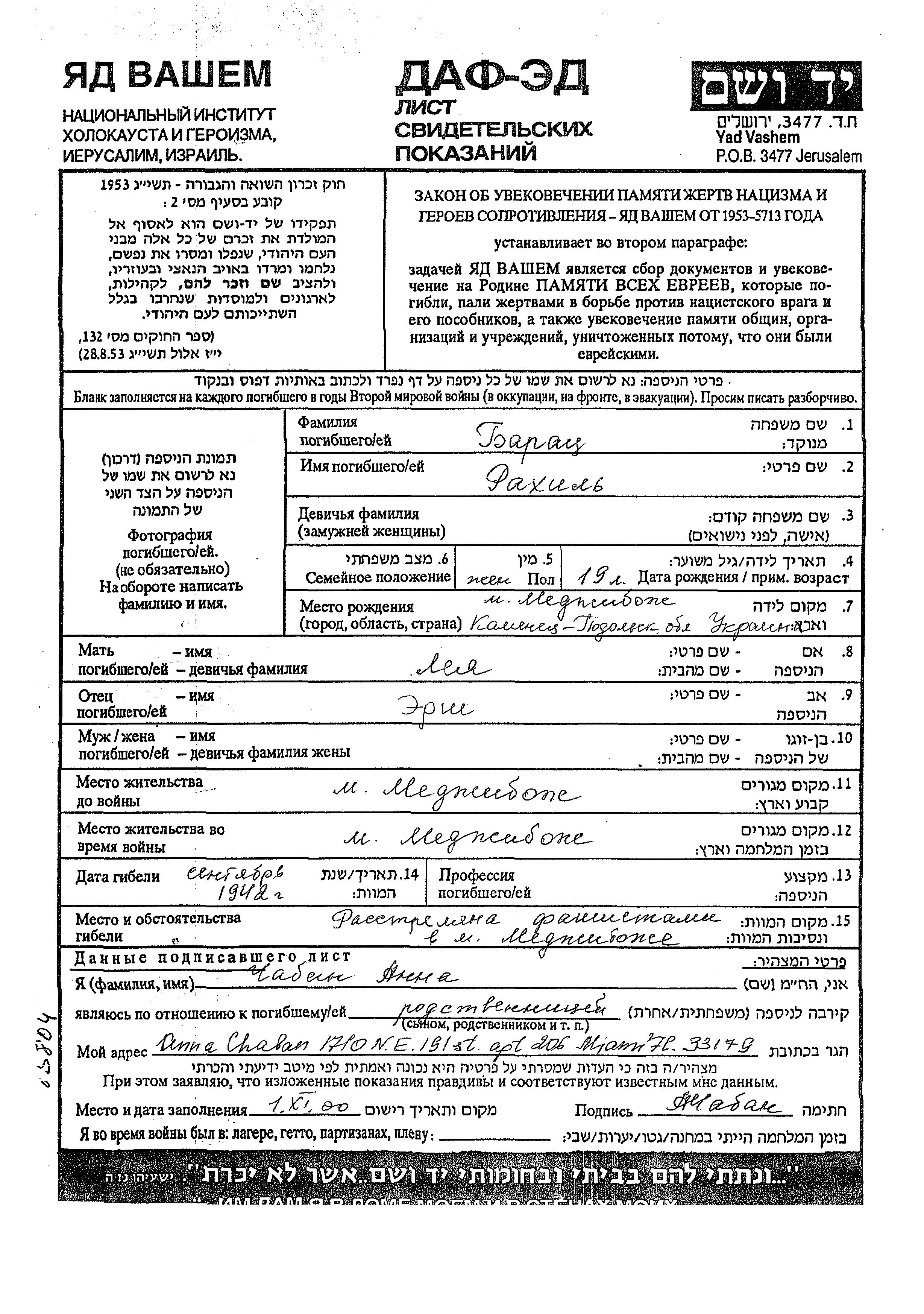 Барац Рахиль Меджибож, Украина (СССР) Лист свидетельских показаний