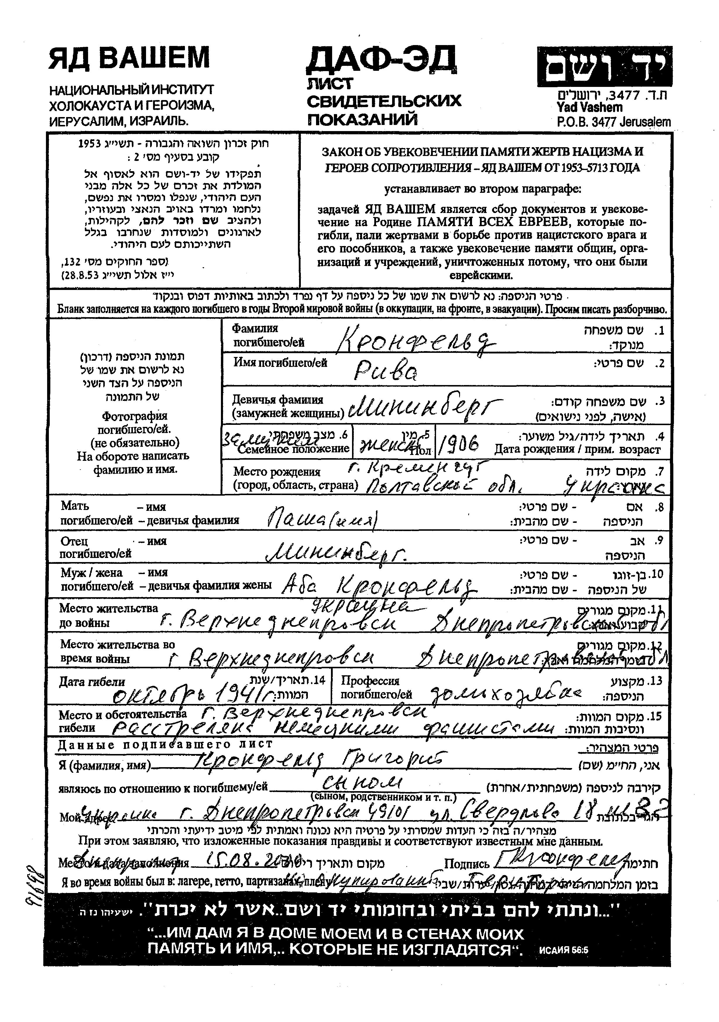 Яд Вашем - Листы свидетельских показаний Мемориального фонда