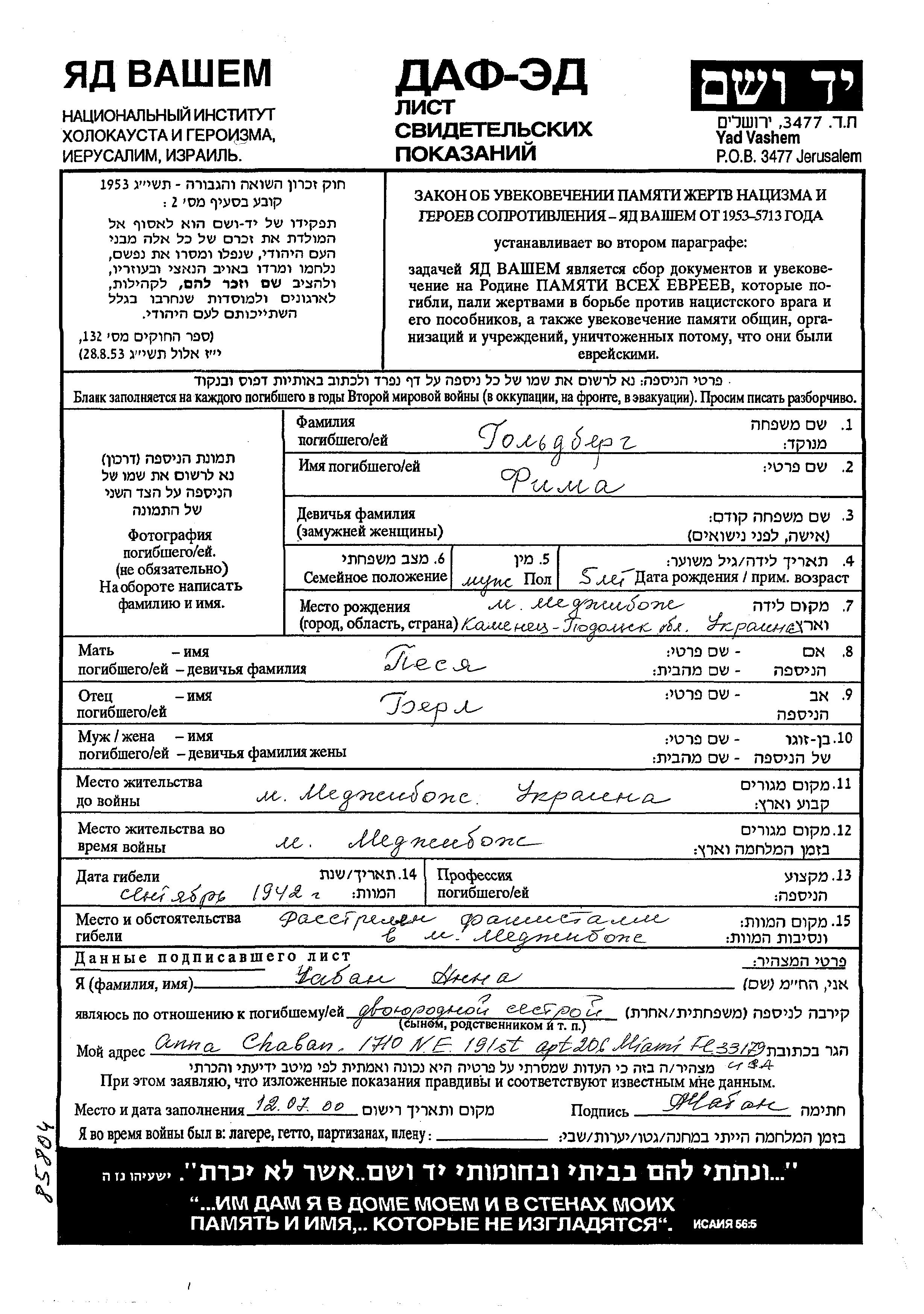 Гольдберг Фима Меджибож, Украина (СССР) Лист свидетельских показаний