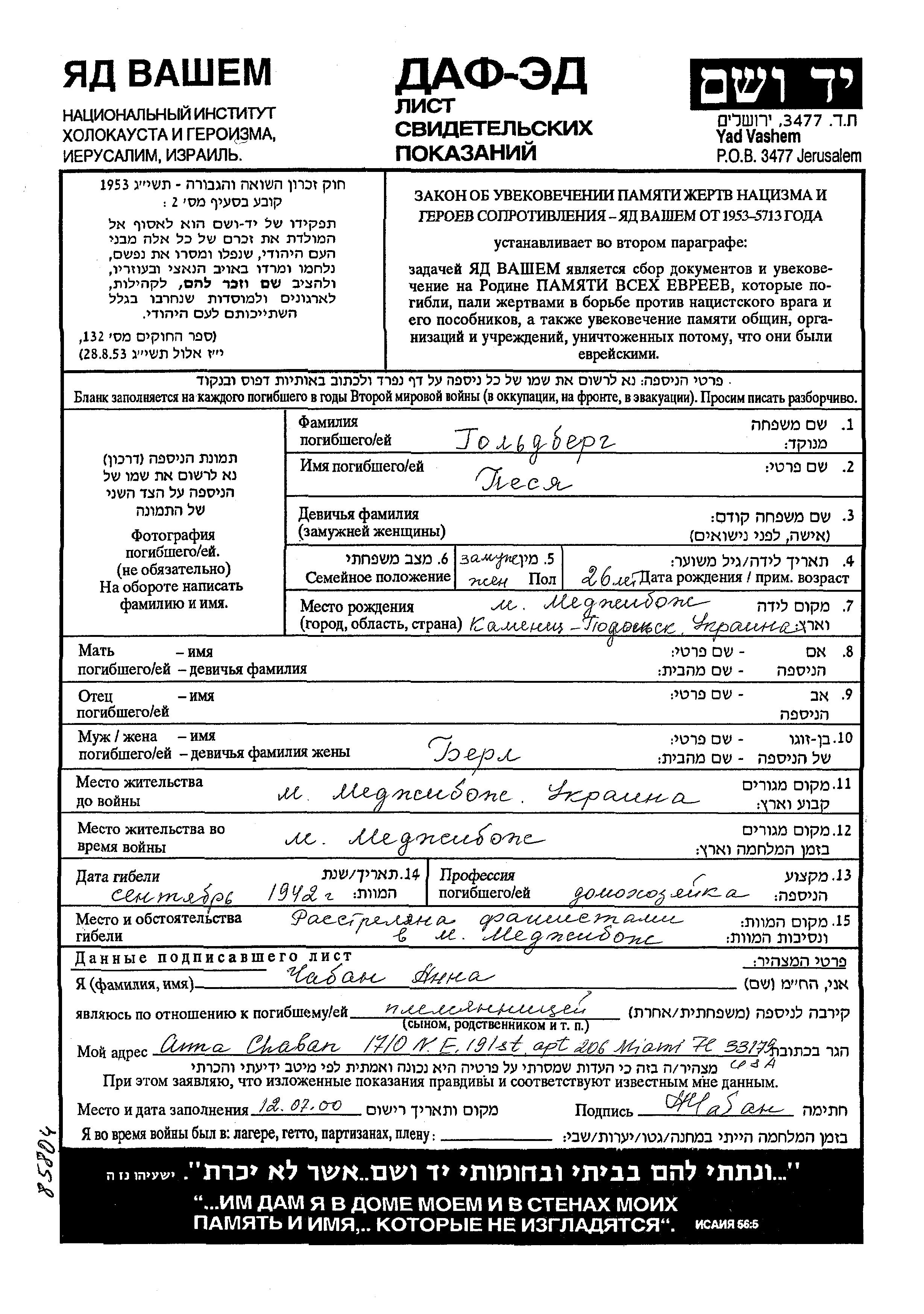 Гольдберг Песя Меджибож, Украина (СССР) Лист свидетельских показаний