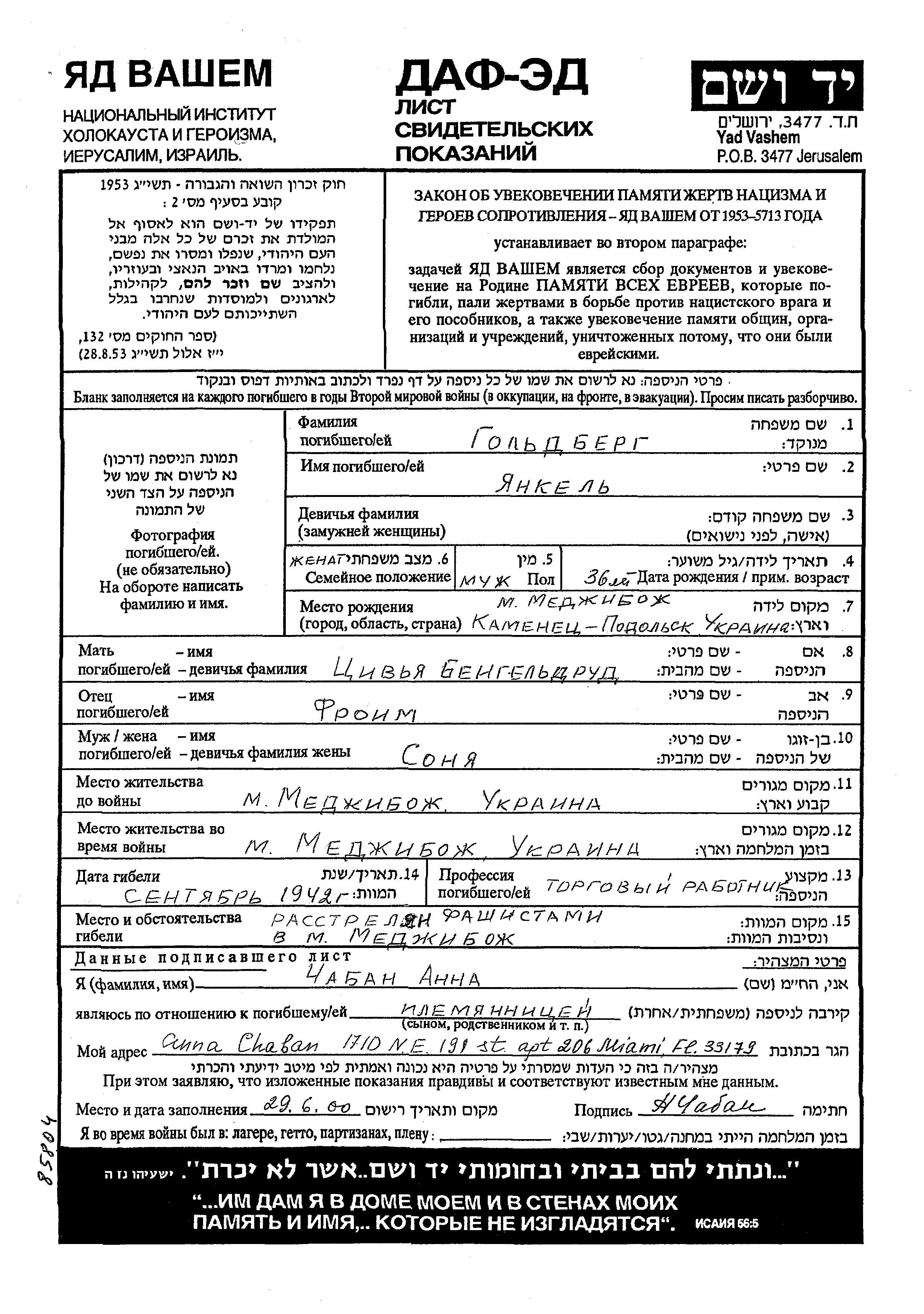 Гольдберг Янкель 1906 Меджибож, Украина (СССР) Лист свидетельских показаний