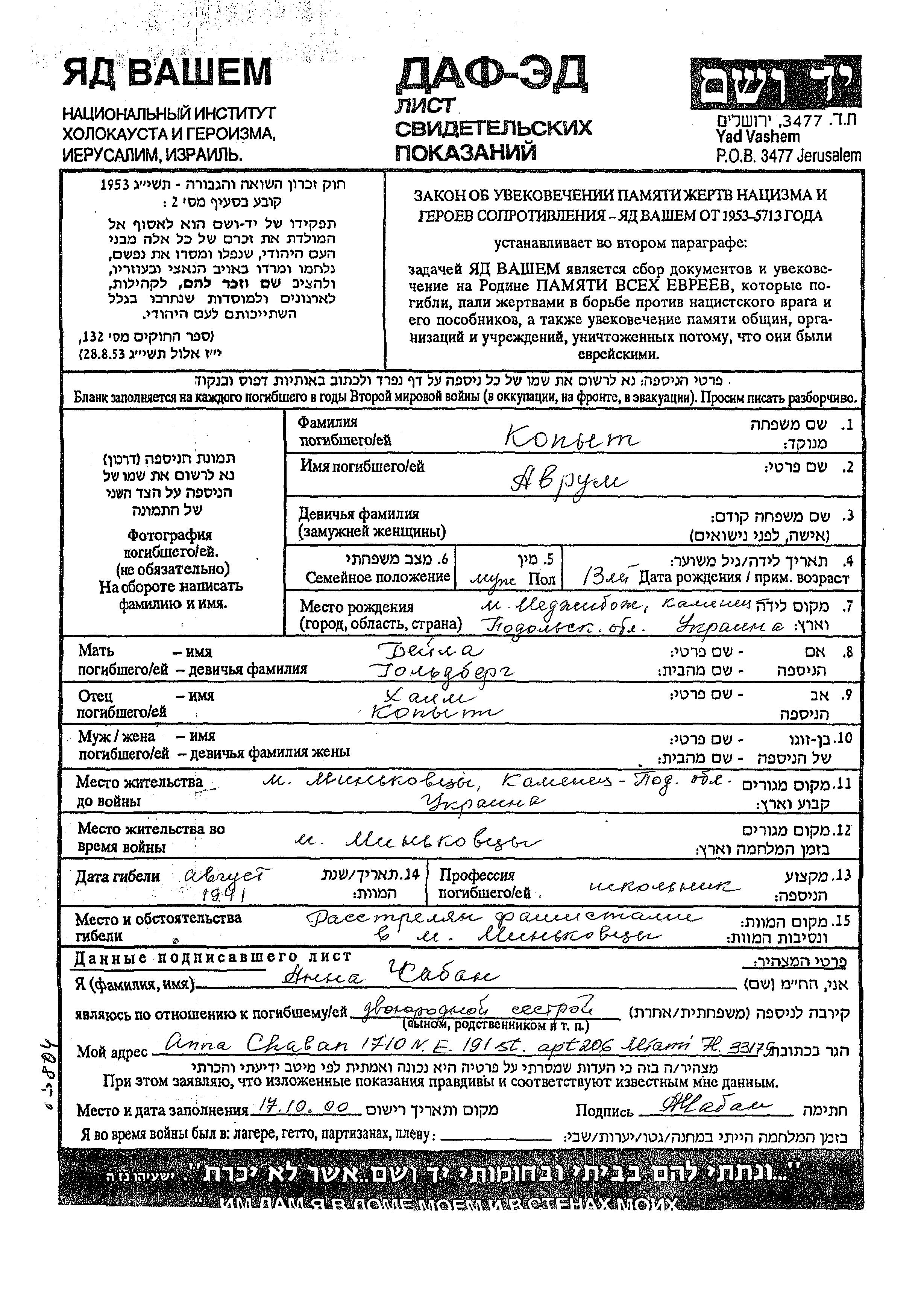 Копыт Аврум Минковцы, Украина (СССР) Лист свидетельских показаний