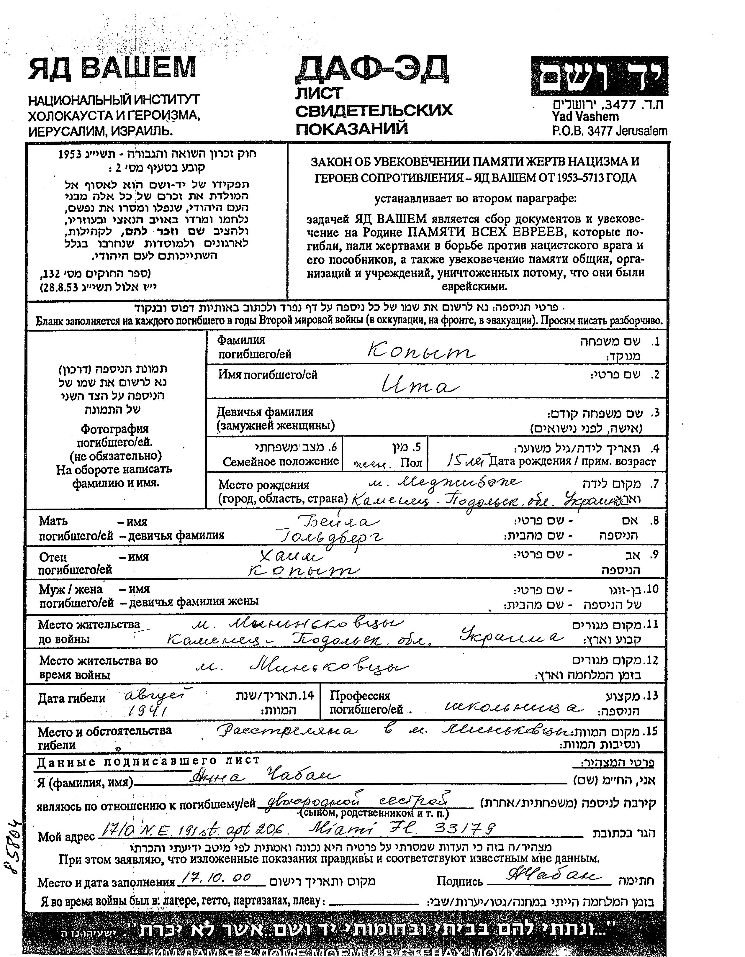 Копыт Ита Минковцы, Украина (СССР) Лист свидетельских показаний