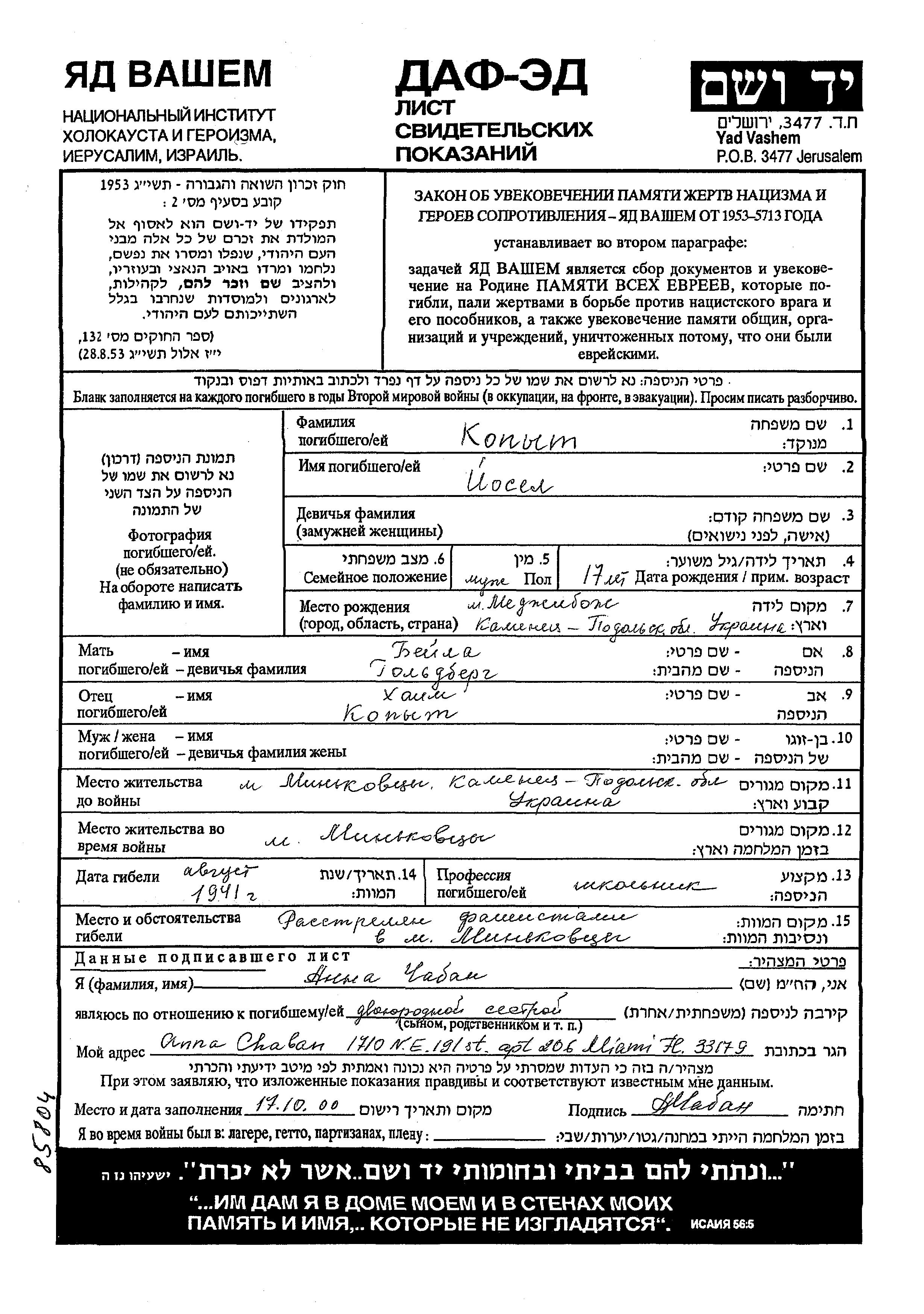 Копыт Йосел Минковцы, Украина (СССР) Лист свидетельских показаний