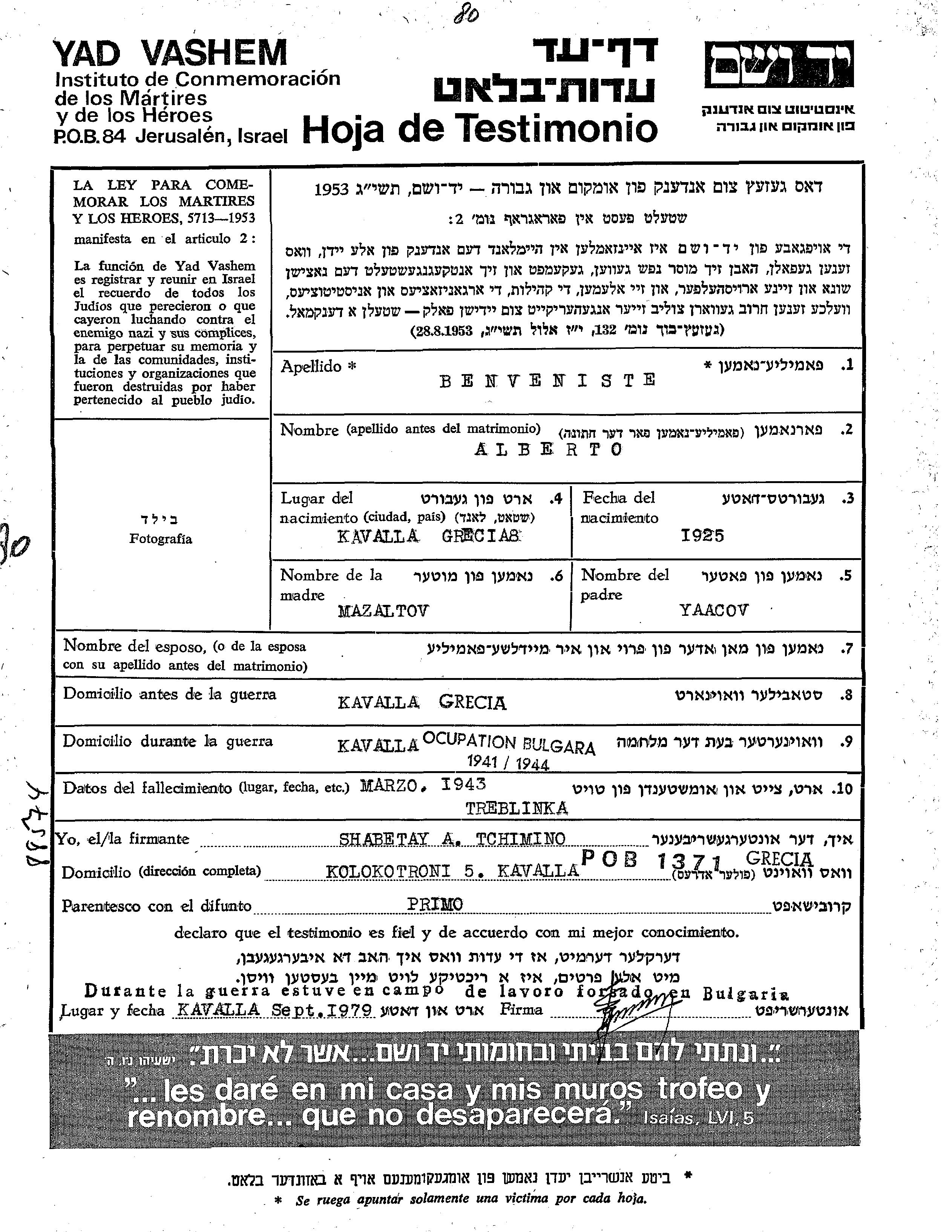 Альберто Бенвенисте, место рождения: Кавалла, Греция. Отец: Яааков, mать:Мазальтов. Место жительства до войны: Кавалла, Греция. Место во время войны: Кавалла, Греция.