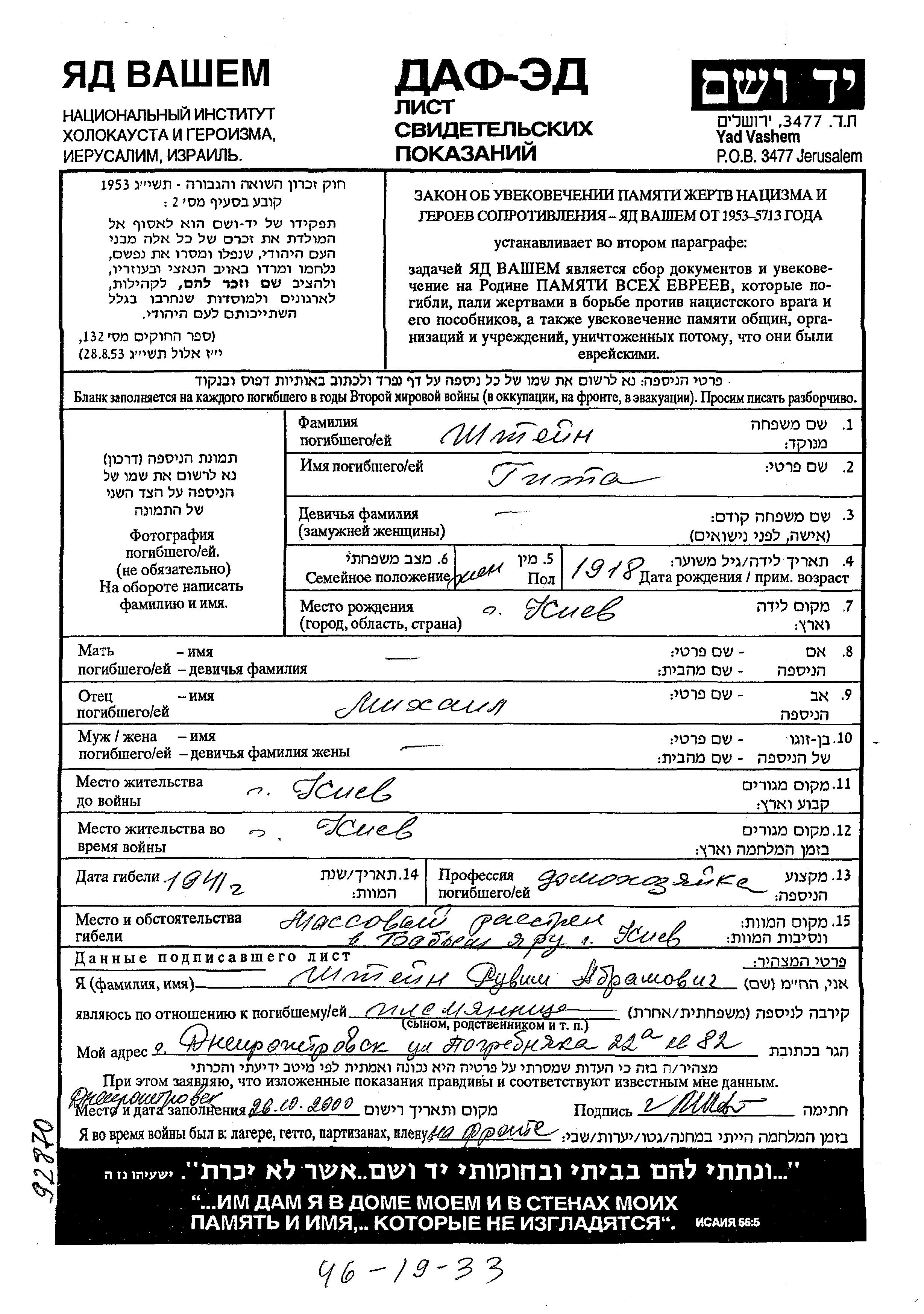 Яд Вашем - Листы свидетельских показаний Мемориального фонда