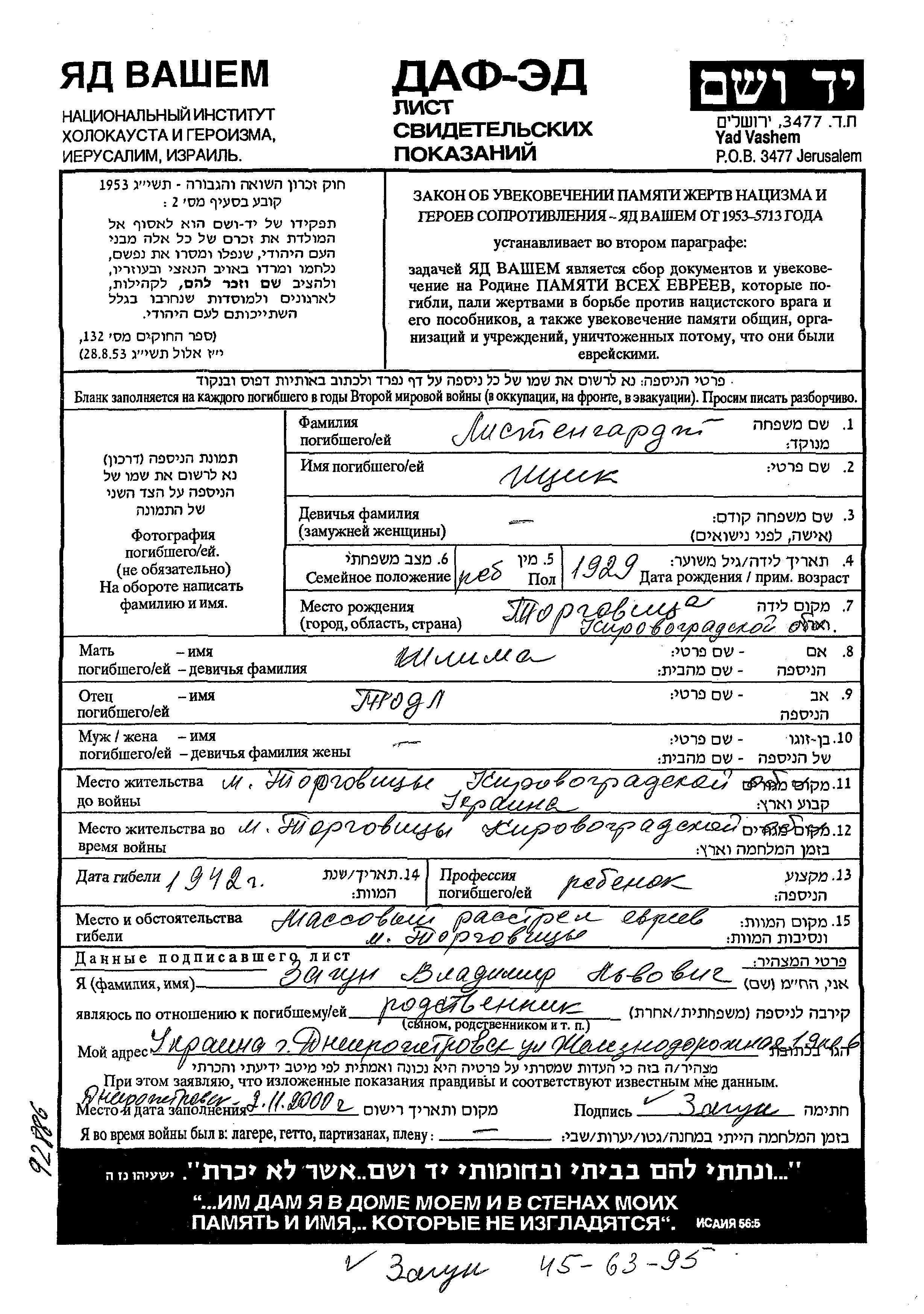Яд Вашем - Листы свидетельских показаний Мемориального фонда