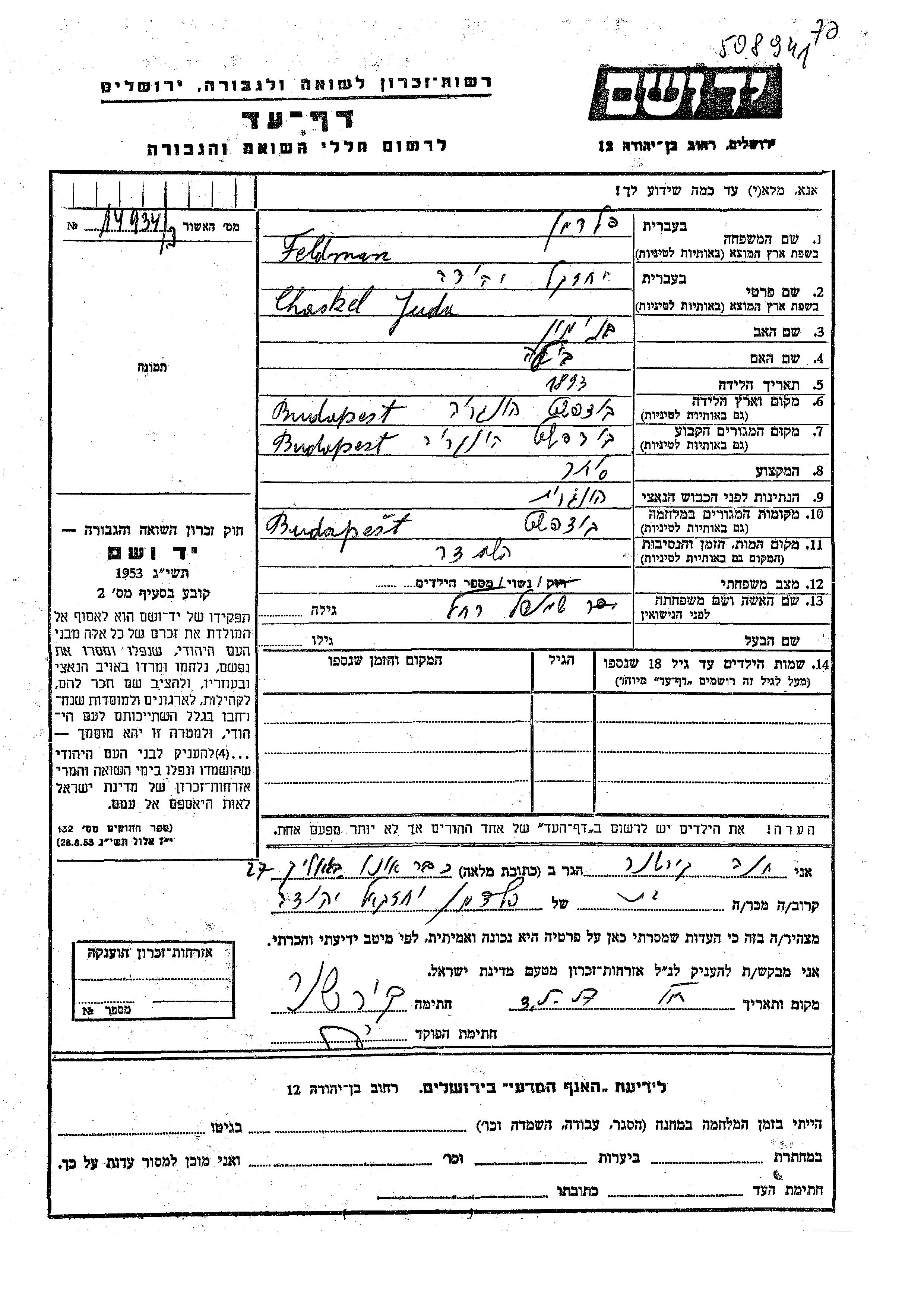 Хаскель Юда Фельдман, место рождения: Будапешт, Венгрия. Отец: Беньямин, mать:Била. Торговец / торговка. Женат / замужем. Место жительства до войны: Будапешт, Венгрия. Место во время войны: Будапешт, Венгрия.