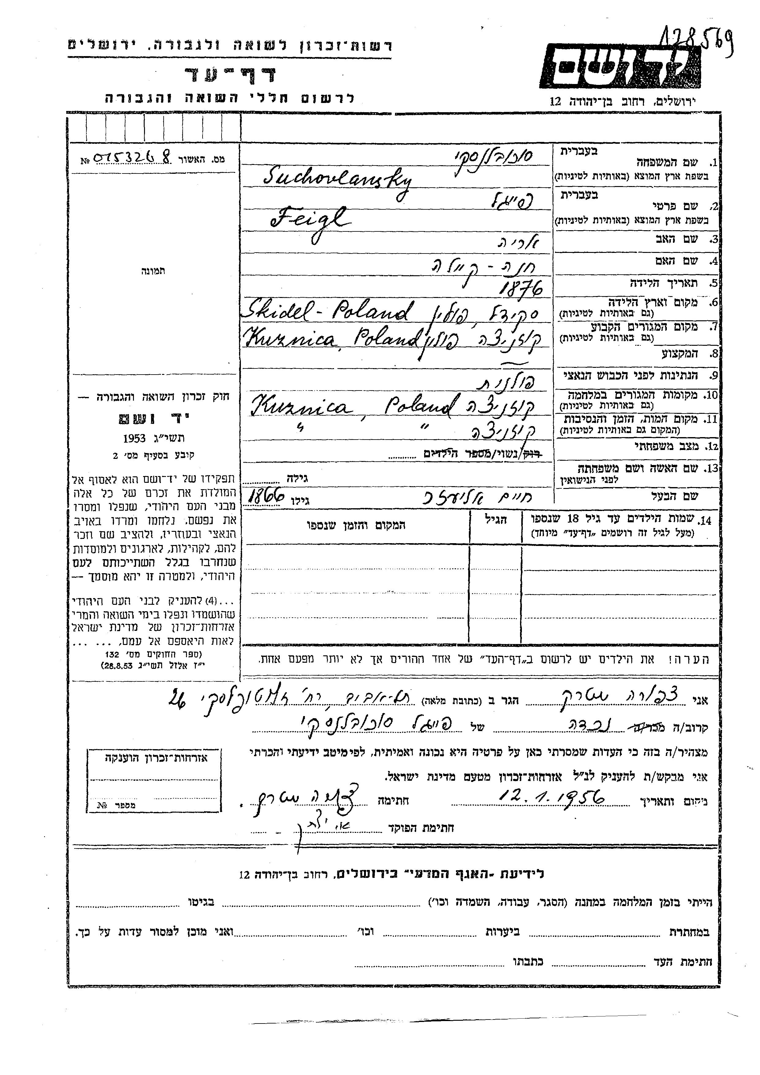 Файгель Суховлански, место рождения: Скидель, Польша. Отец: Арье, mать:Хана Кейла. Женат / замужем. Место жительства до войны: Кузница, Польша. Место во время войны: Кузница, Польша.