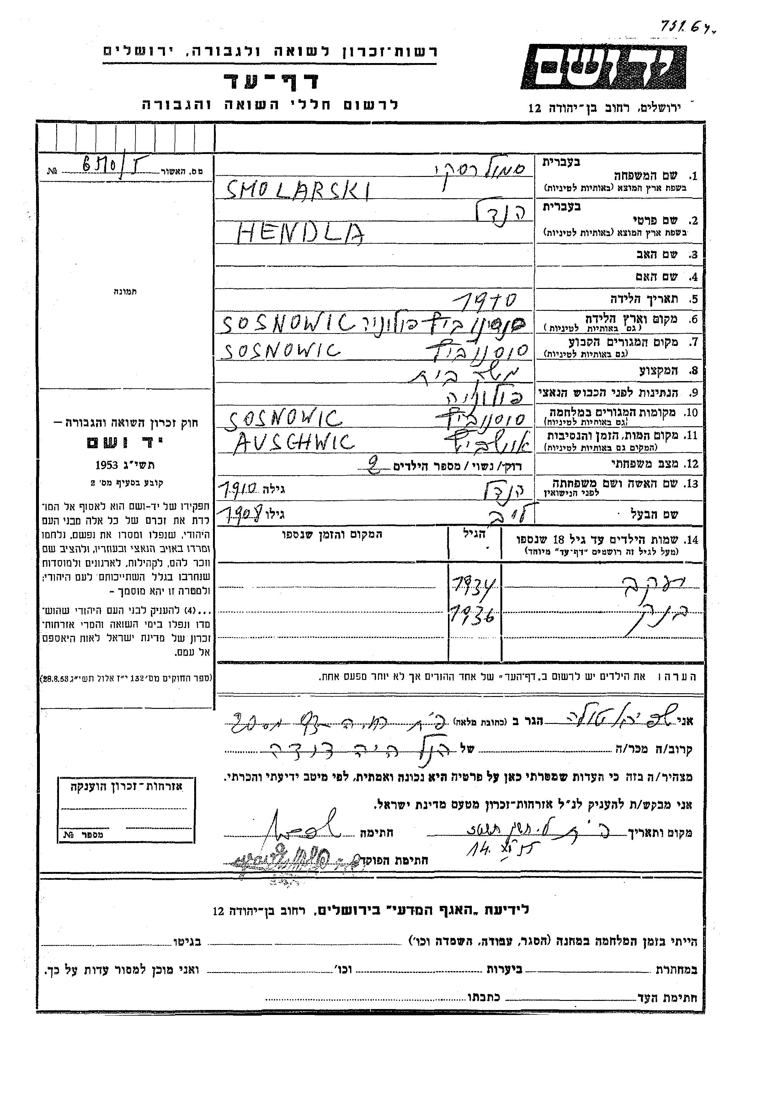 Хендла Смолярски, место рождения: Сосновиц, Польша. Домашнее хозяйство. Женат / замужем. Место жительства до войны: Сосновиц, Польша. Место во время войны: Сосновиц, Польша.