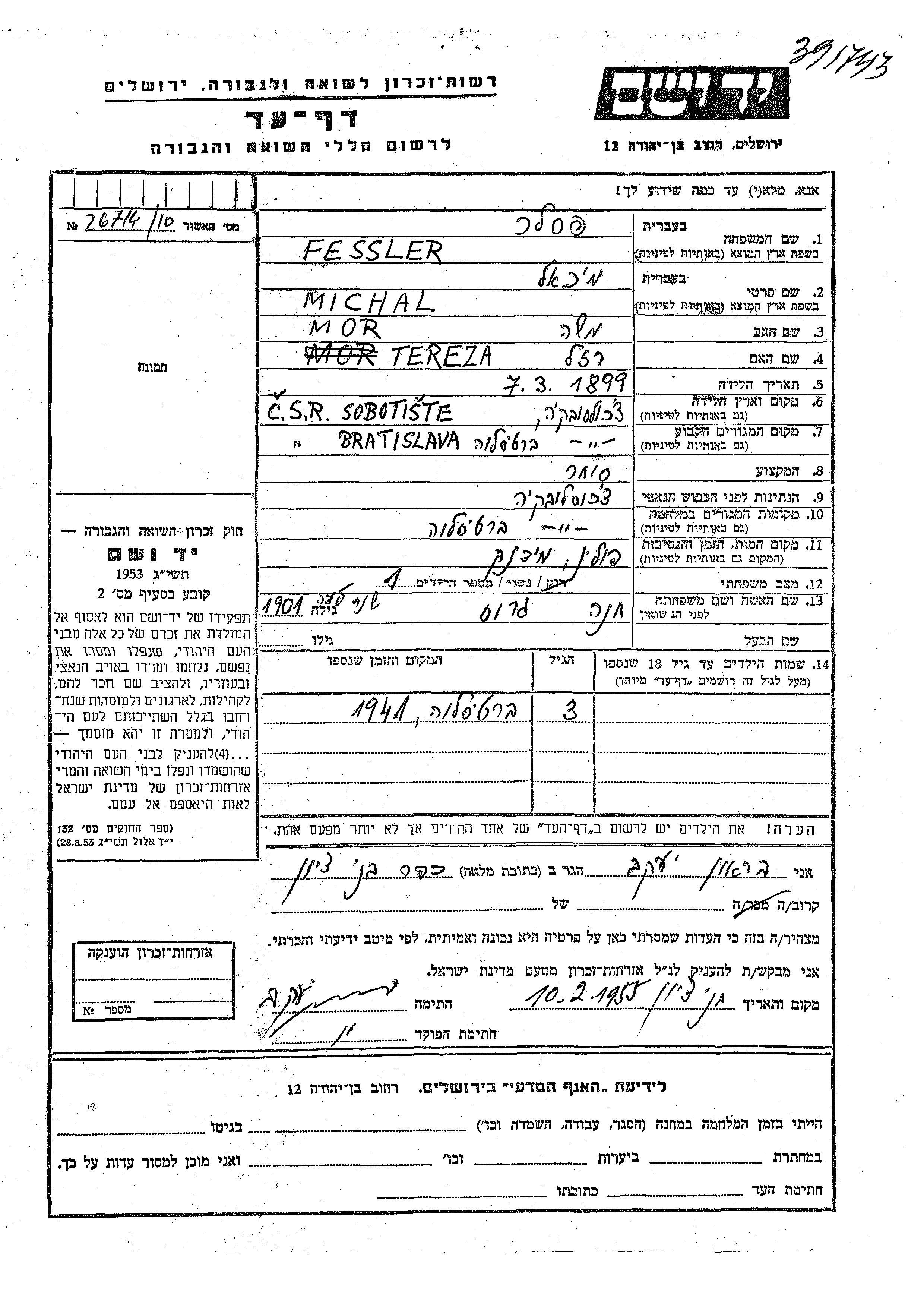 Михаль Михаэль Фесслер, место рождения: Соботиште, Чехословакия. Отец: Мор Моше, mать:Резл Тереза. Торговец / торговка. Женат / замужем. Место жительства до войны: Братислава, Чехословакия. Место во время войны: Братислава, Чехословакия.