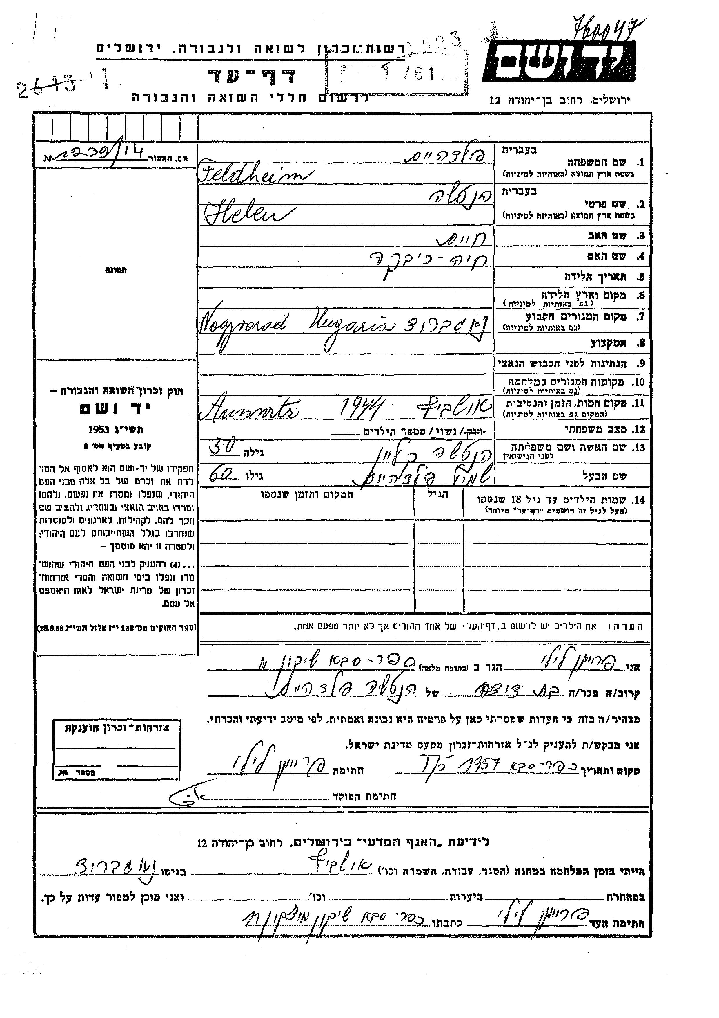 Фельдхейм Хенча Хелен Ногбарод, Румыния Лист свидетельских показаний