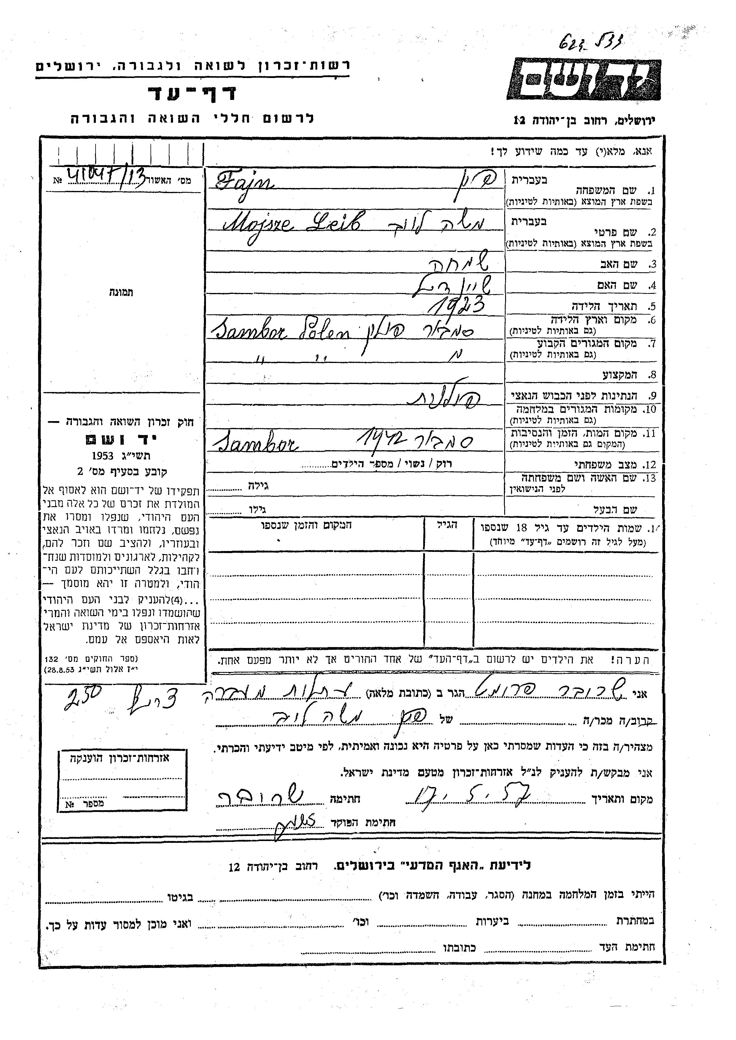 Моше Лейб Файн Фин, место рождения: Самбор, Польша. Отец: Симха, mать:Шейндил. Место жительства до войны: Самбор, Польша.