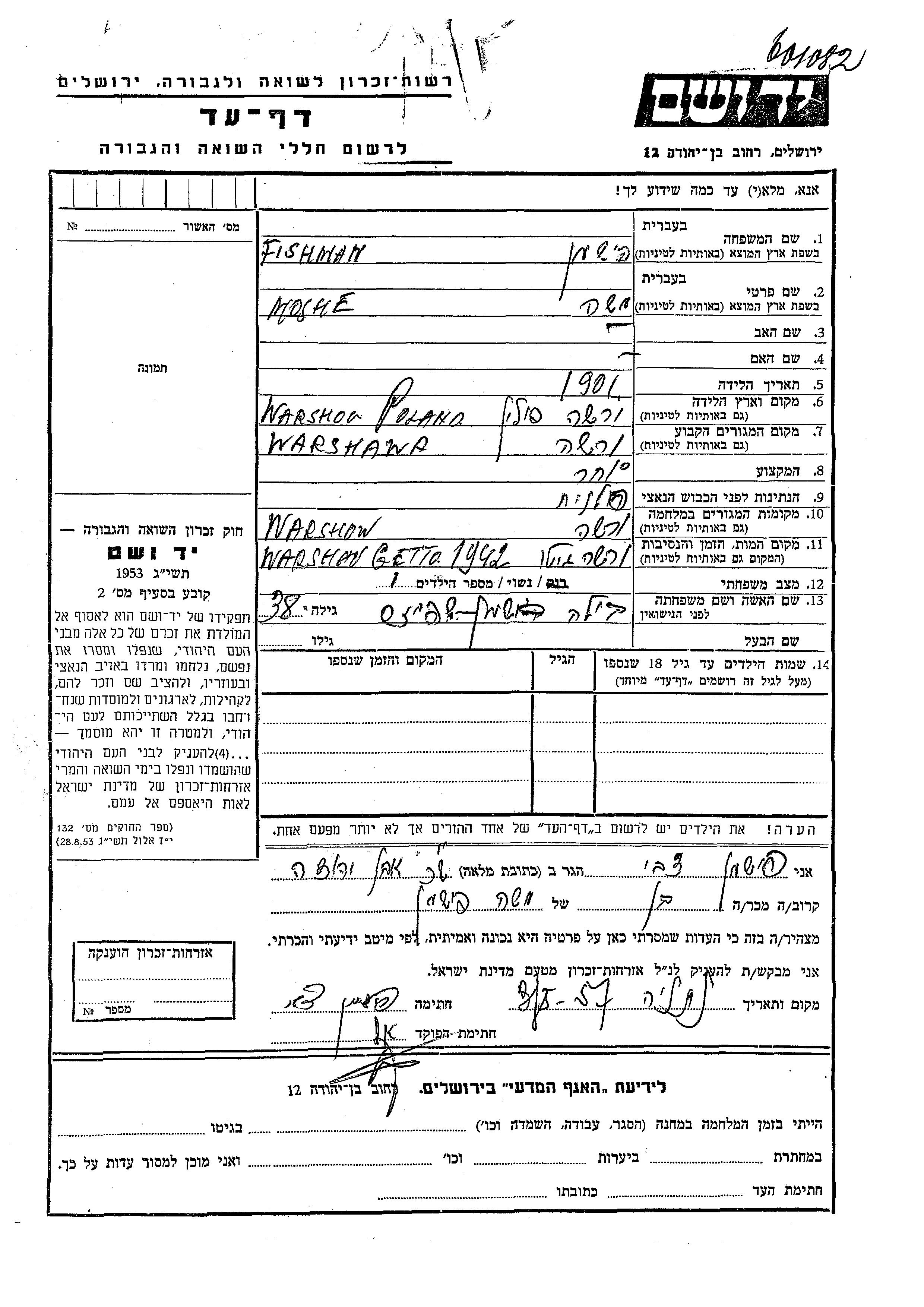 Моше Фишман, место рождения: Варшава, Польша. Торговец / торговка. Женат / замужем. Место жительства до войны: Варшава, Польша. Место во время войны: Варшава, Польша.