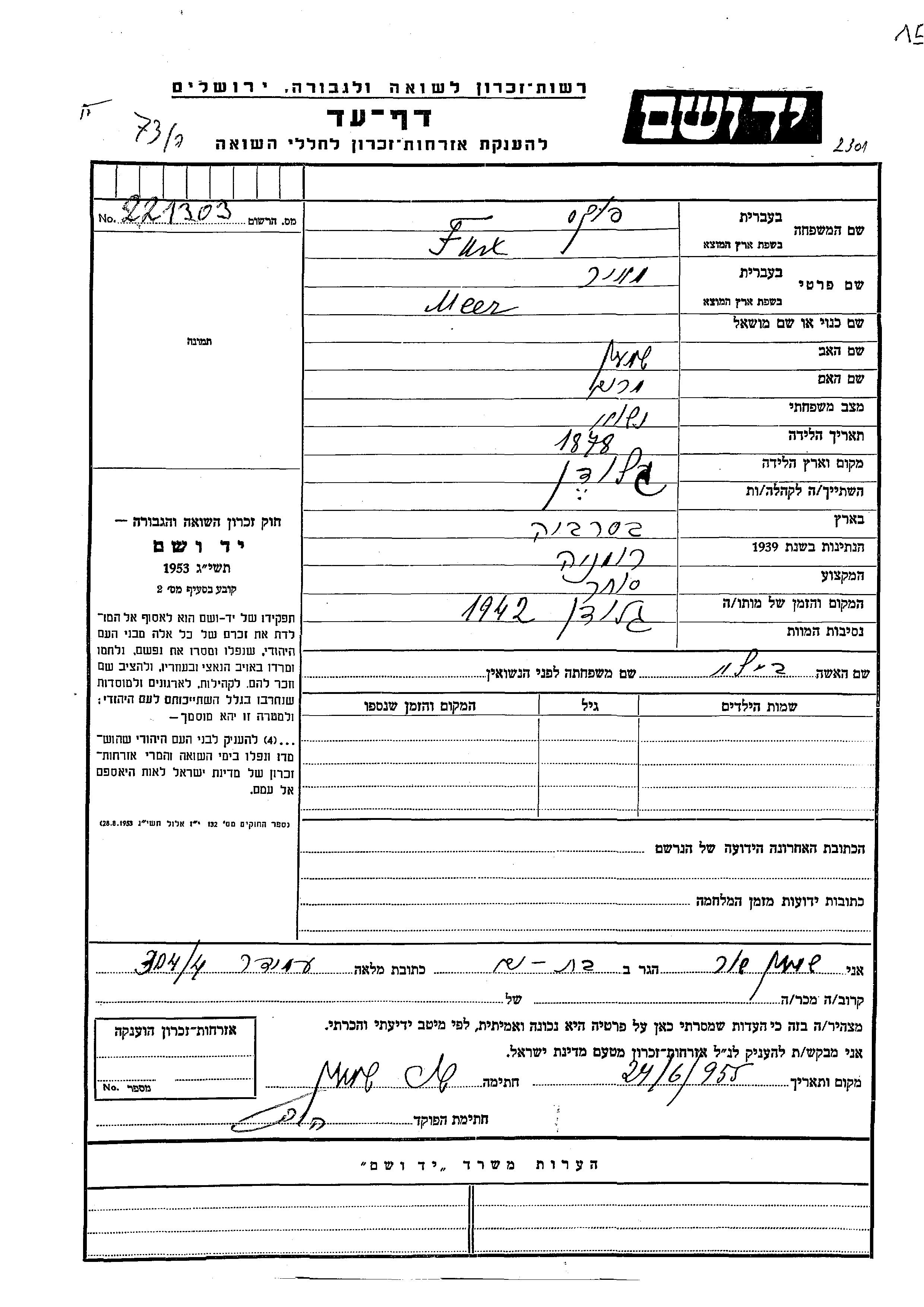 Меер Фукс, место рождения: Глодень, Румыния. Отец: Шимон, mать:Мирьям. Торговец / торговка. Женат / замужем.
