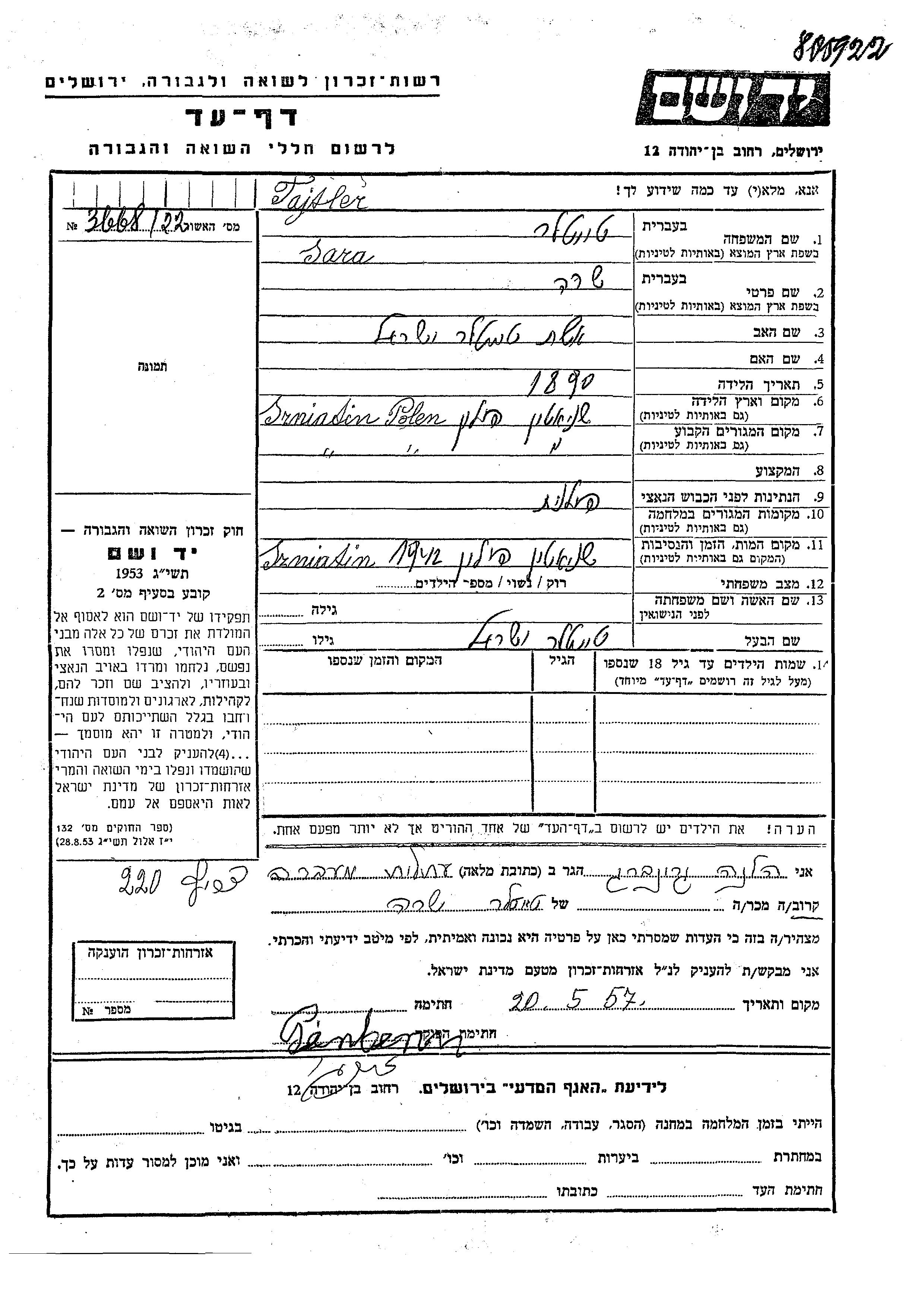 Тейтлер Сара 1890 Снятын, Польша Лист свидетельских показаний