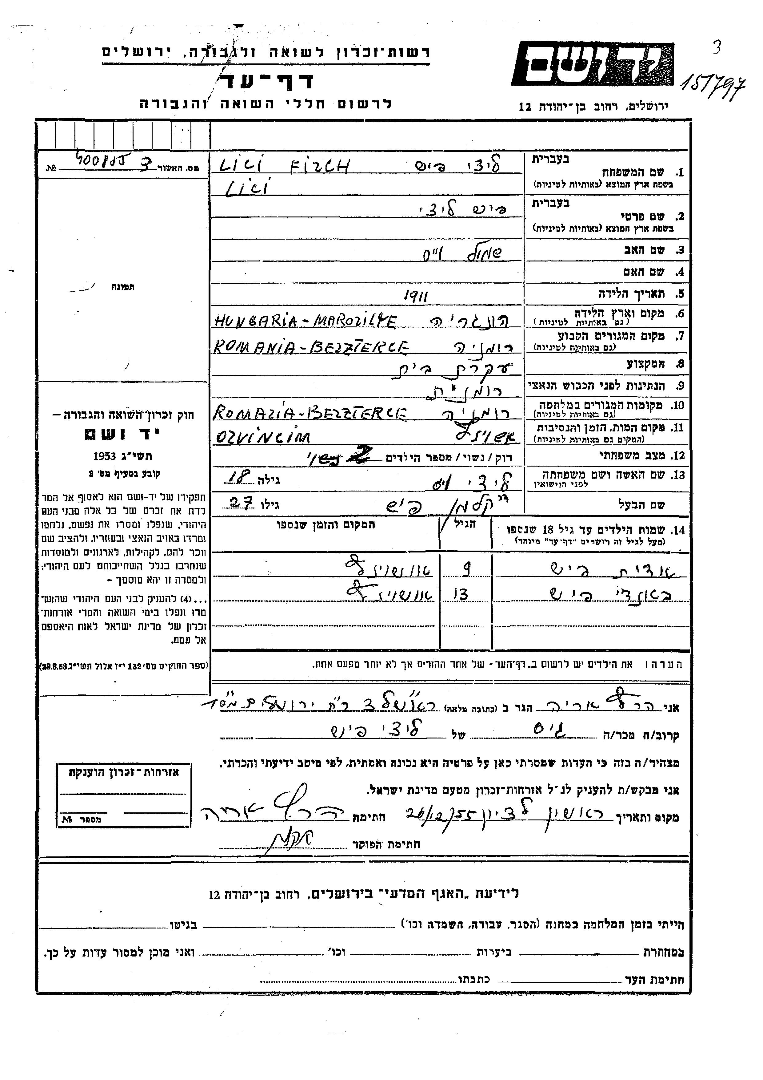 Фиш Лици 1911 Бестерце, Румыния Лист свидетельских показаний