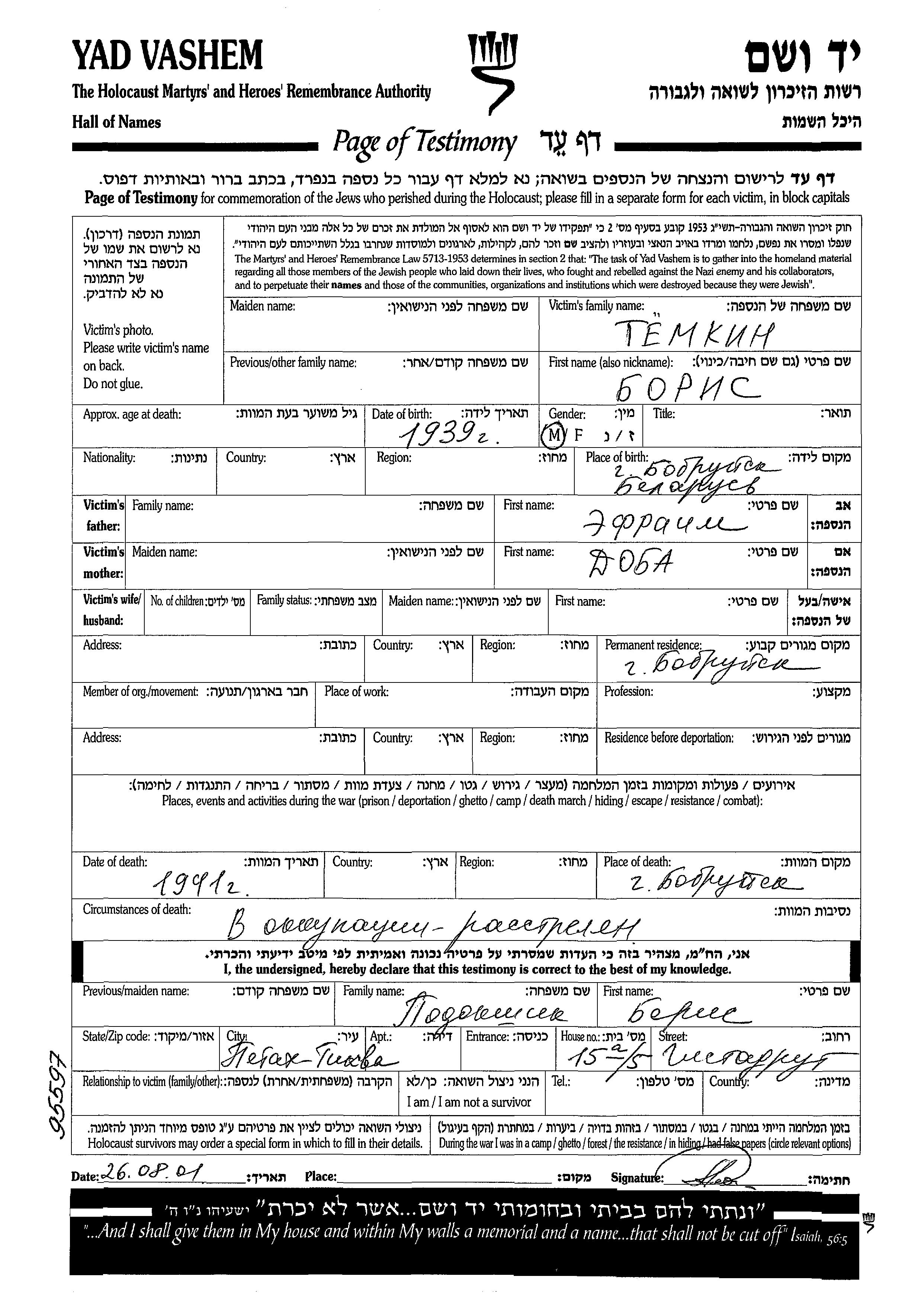 Борис Тёмкин, место рождения: Бобруйск, Белоруссия (СССР). Отец: Эфраим, mать:Доба. Ребенок. Место жительства до войны: Бобруйск, Белоруссия (СССР).