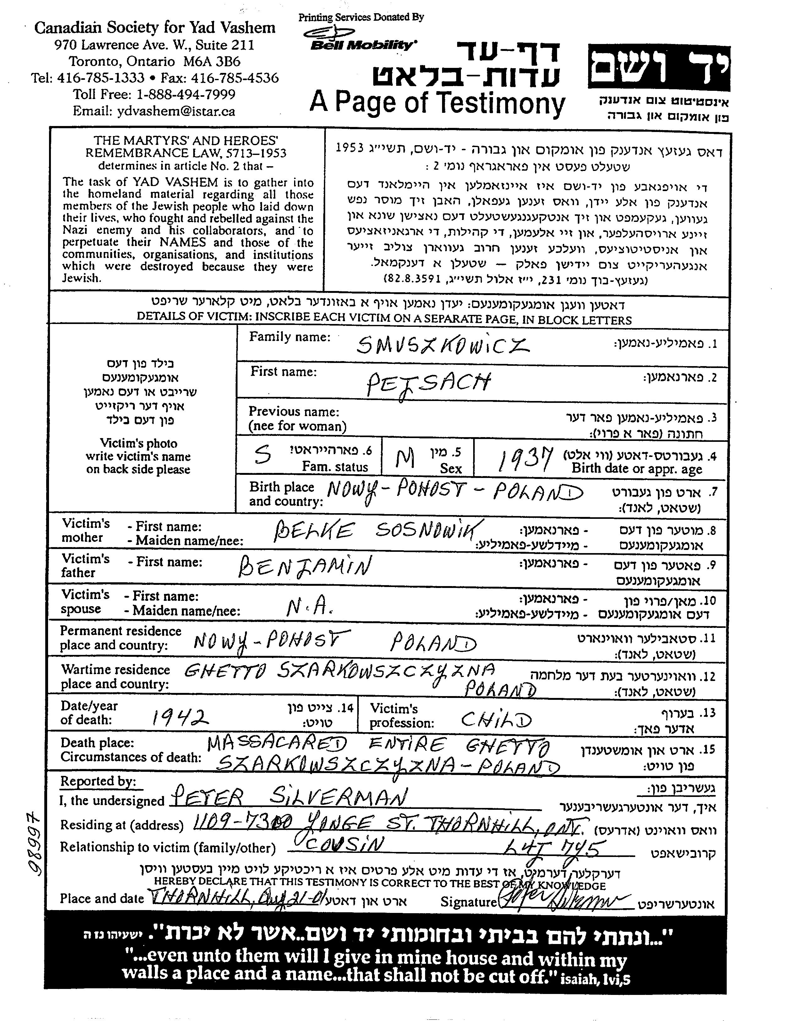 Пейсах Смушкович, место рождения: Новый Погост, Польша. Отец: Беньямин, mать:Белке. Ребенок. Место жительства до войны: Новый Погост, Польша. Место во время войны: Шарковщина, Польша.