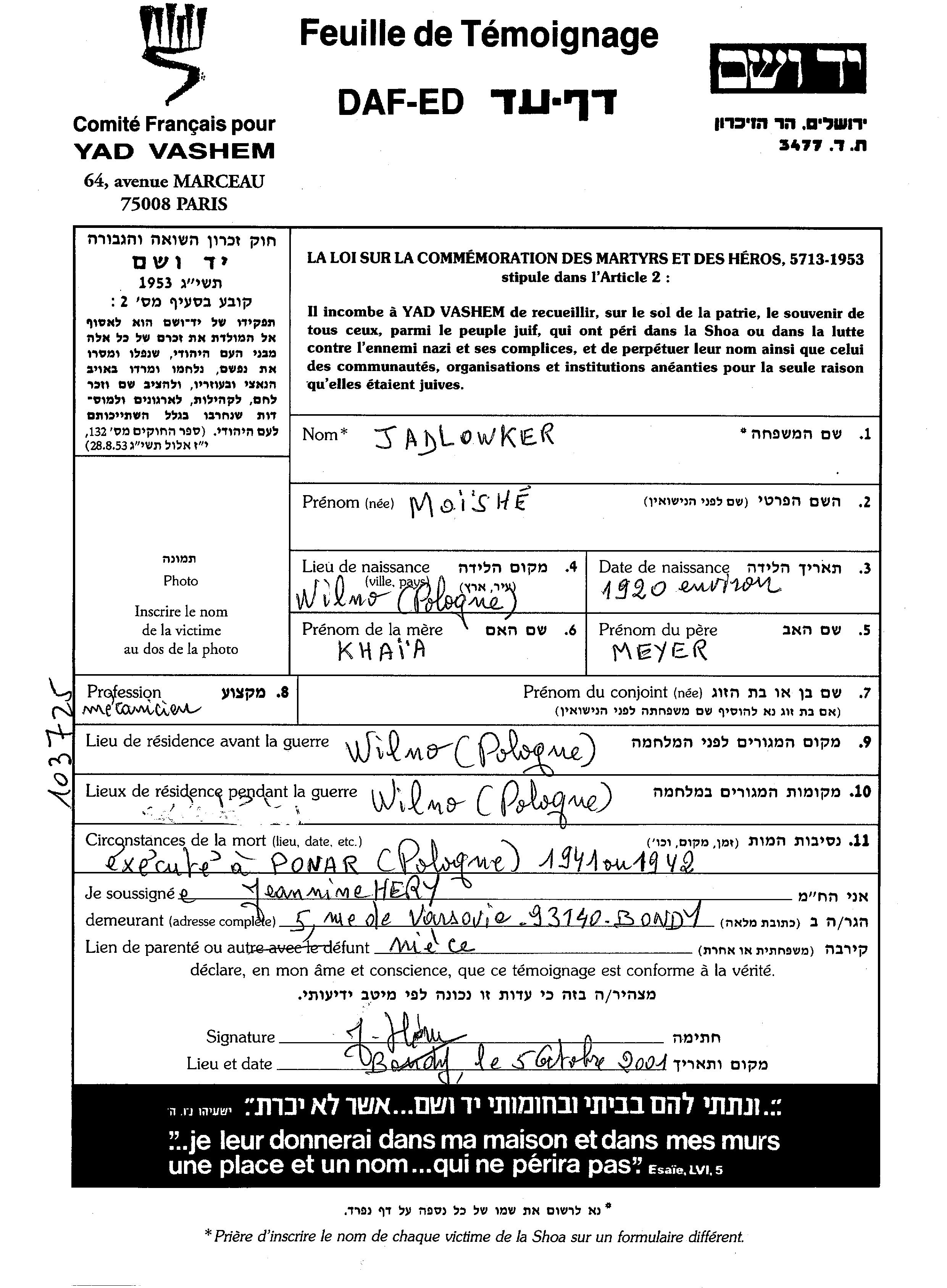 Мойше уничтожен в период Шоа. место смерти: Понары-Окрестности, Польша в 1941.