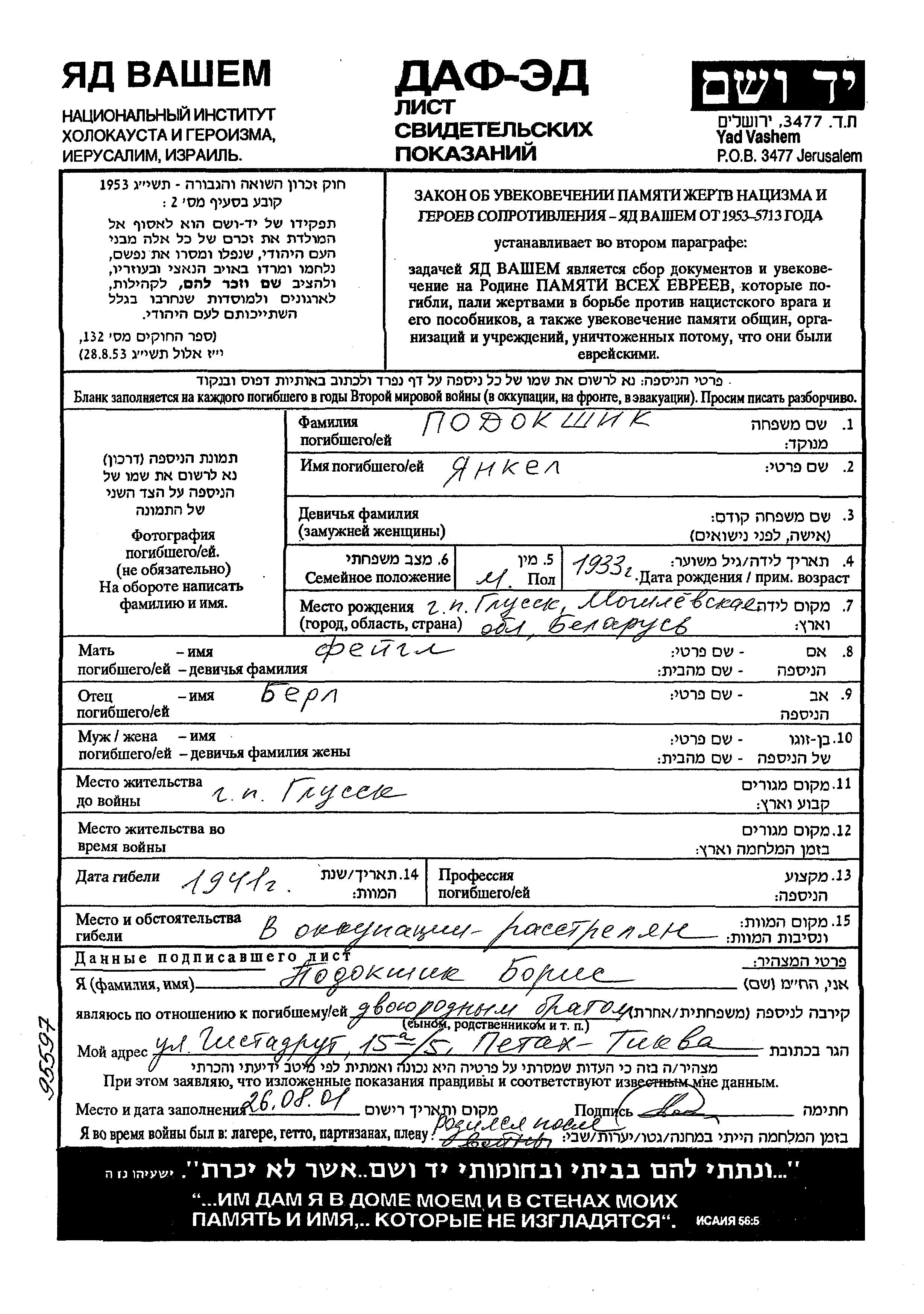 Подокшик Янкель 1933 Глуск, Белоруссия (СССР) Лист свидетельских показаний