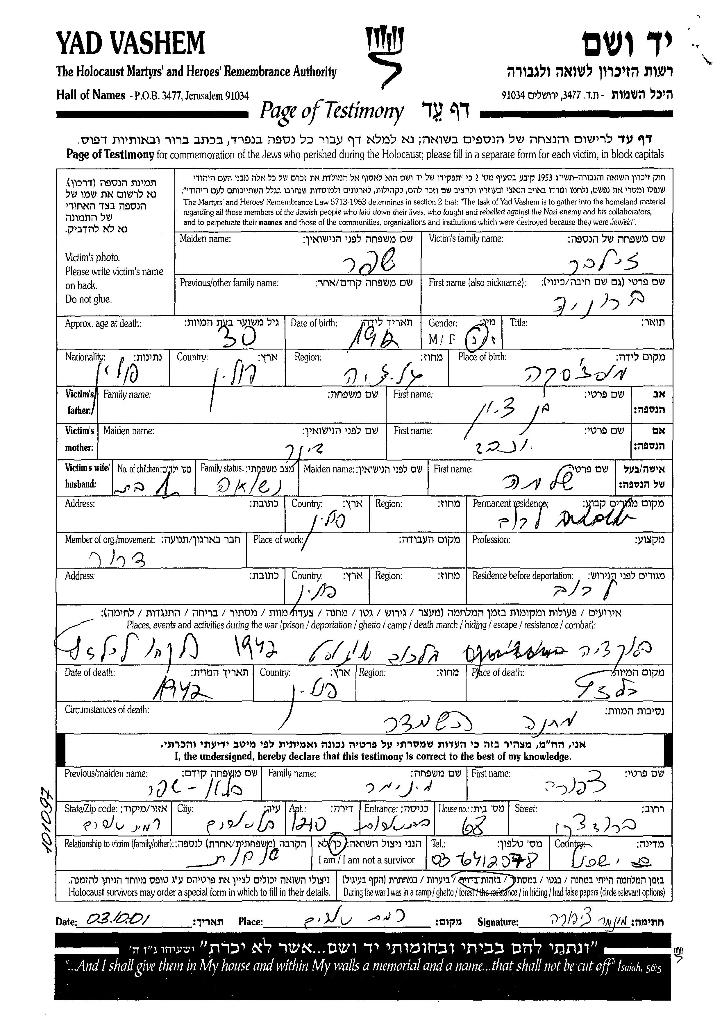 Яд Вашем - Листы свидетельских показаний Мемориального фонда