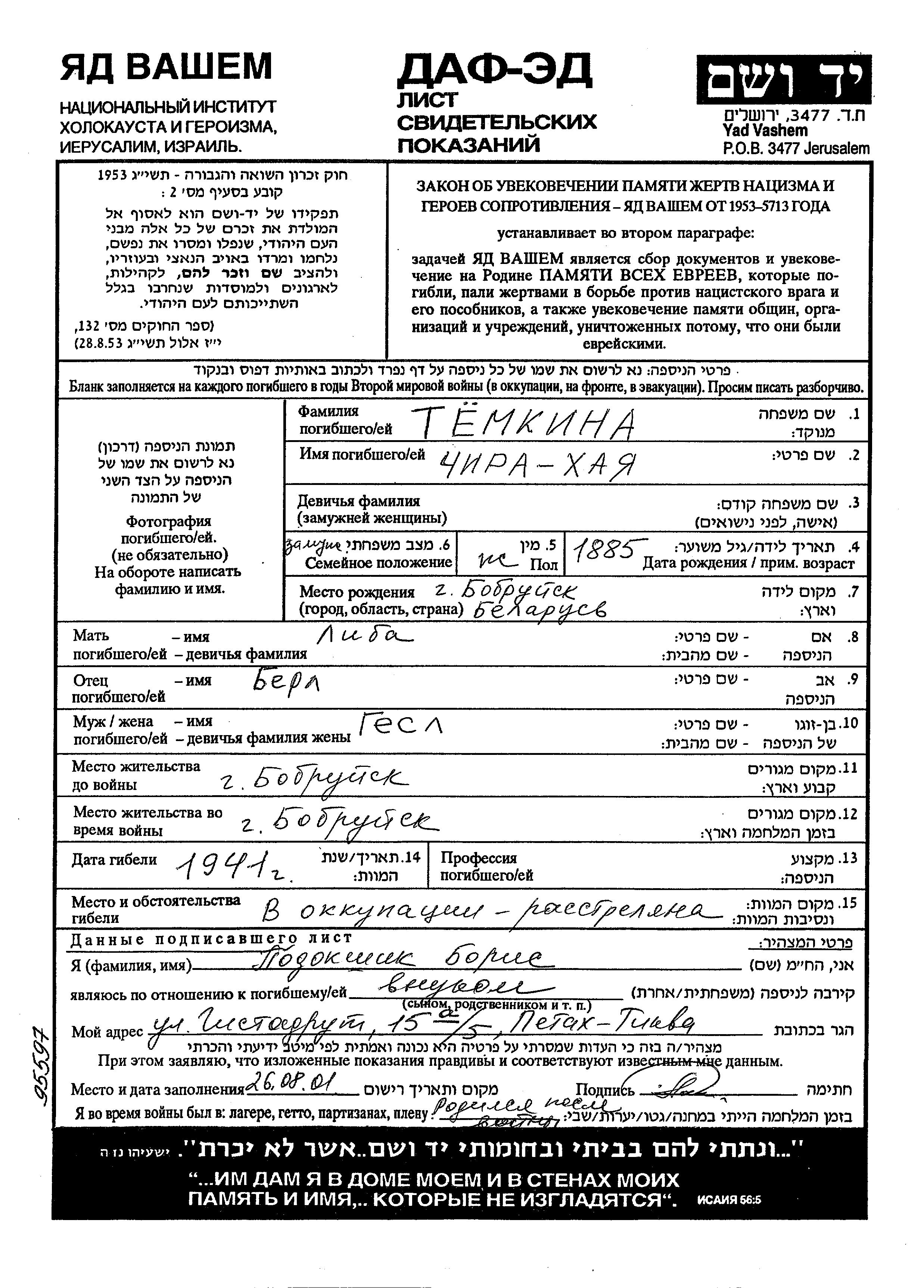 Тёмкина Чира Хая 1885 Бобруйск, Белоруссия (СССР) Лист свидетельских показаний