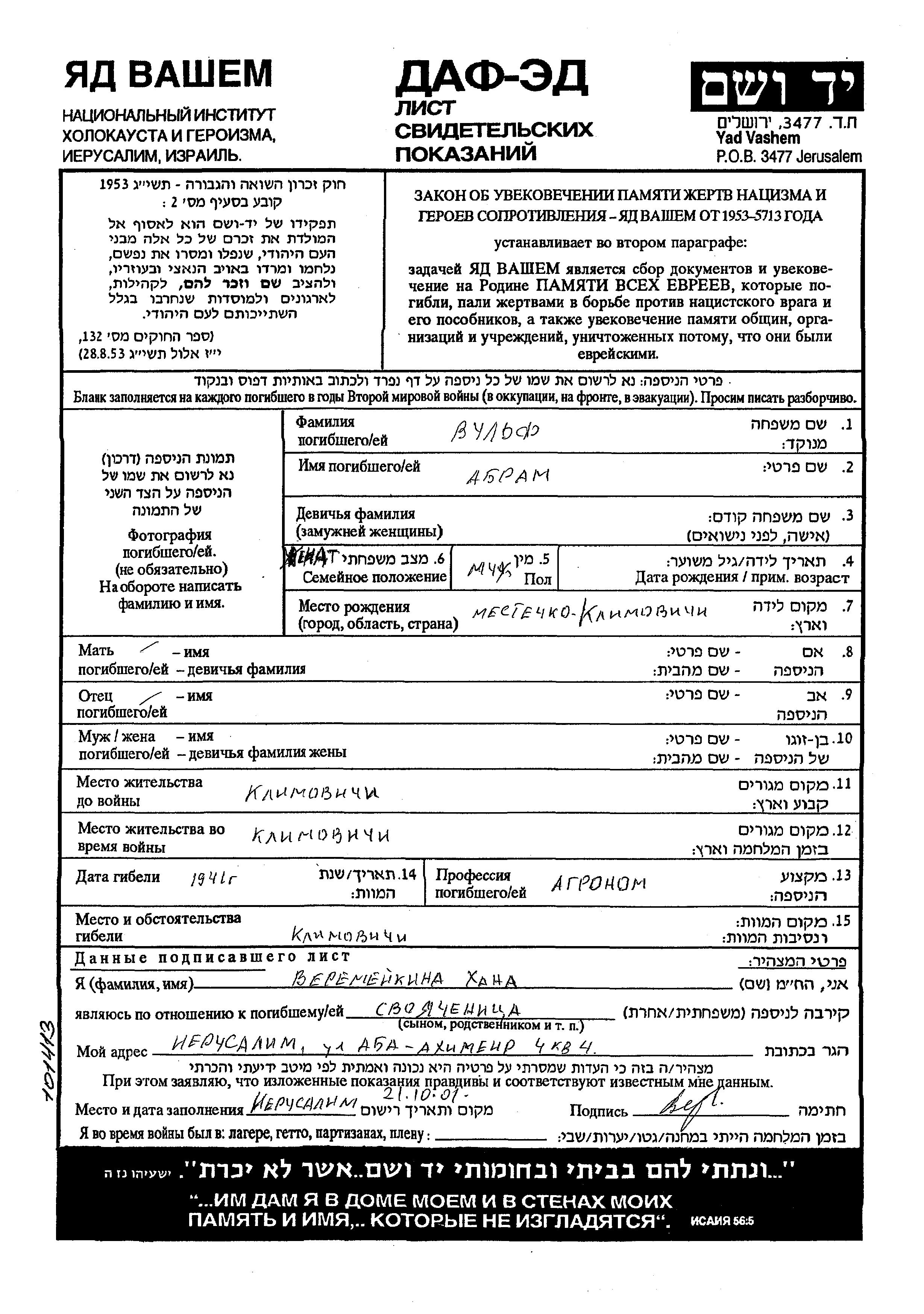 Вульф Абрам Климовичи, Белоруссия (СССР) Лист свидетельских показаний