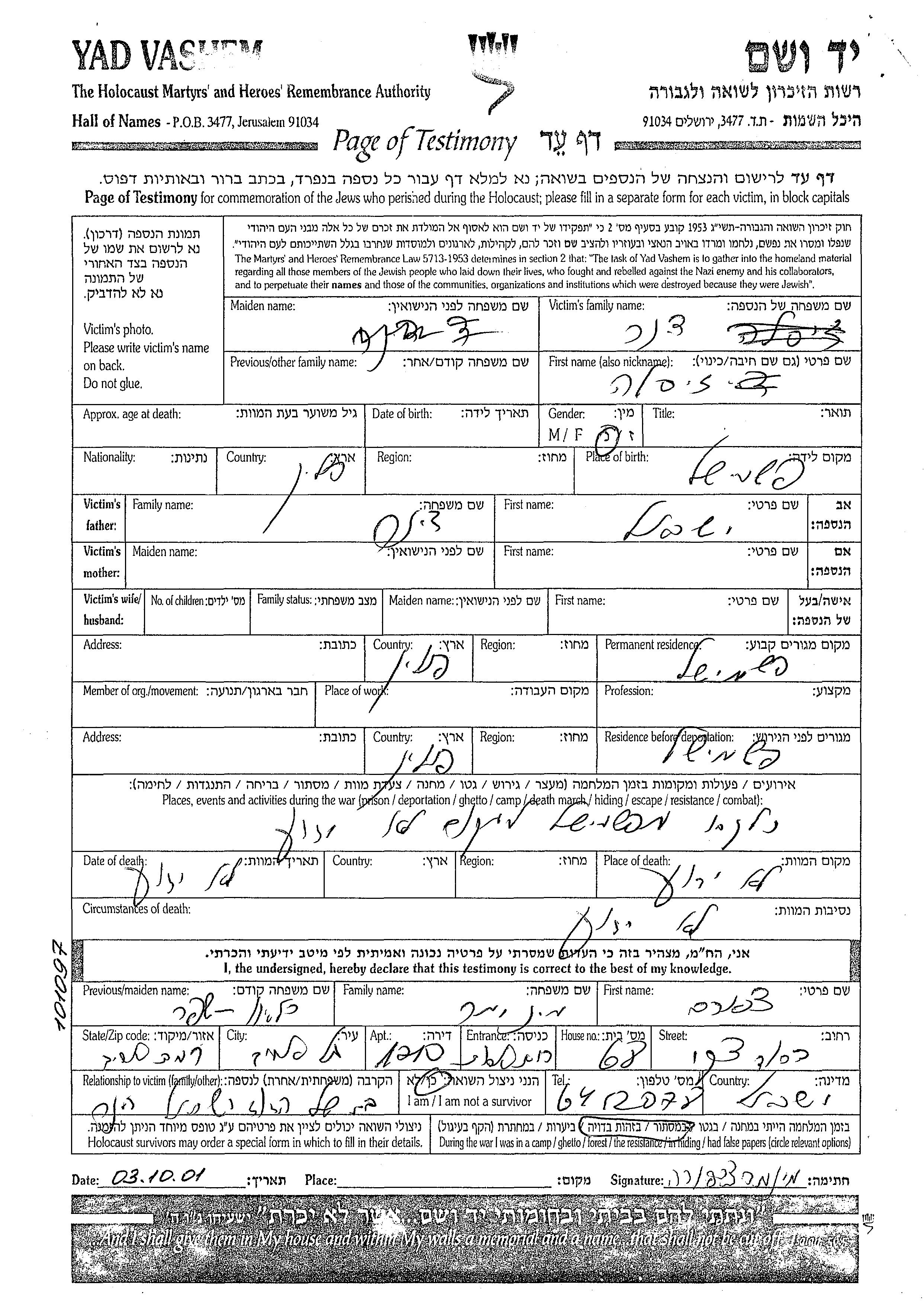 Яд Вашем - Листы свидетельских показаний Мемориального фонда