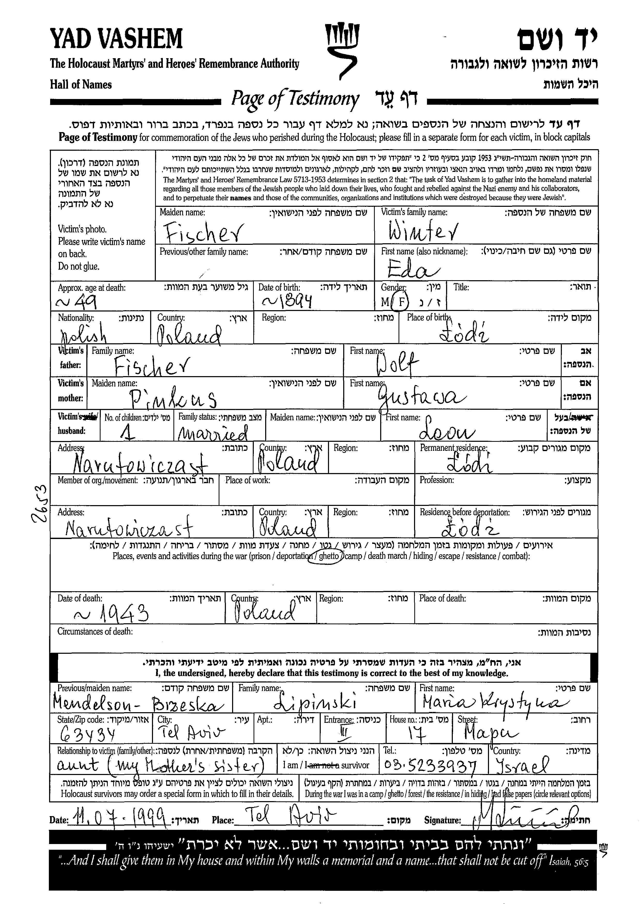 Эда Винтер, девичья фамилия Фишер, место рождения: Лодзь, Польша. Отец: Вольф, mать:Густава. Женат / замужем. Место жительства до войны: Лодзь, Польша. Место во время войны: Лодзь, Польша.