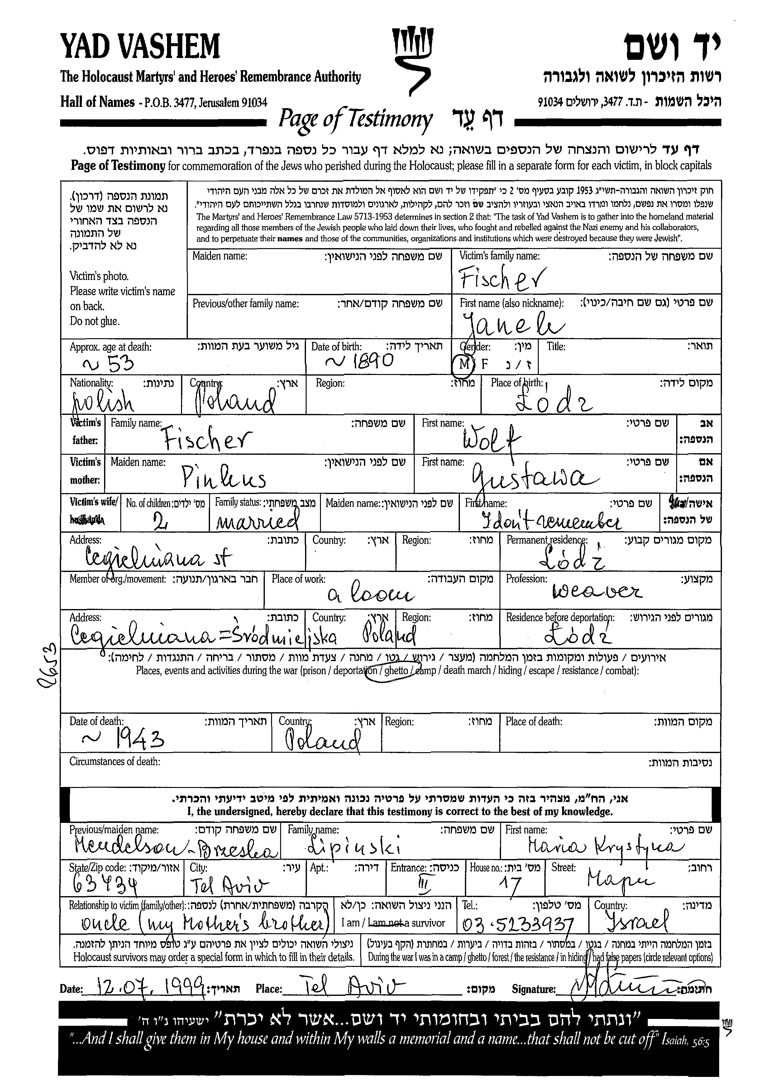 Фишер Янек 1890 Лодзь, Польша Лист свидетельских показаний