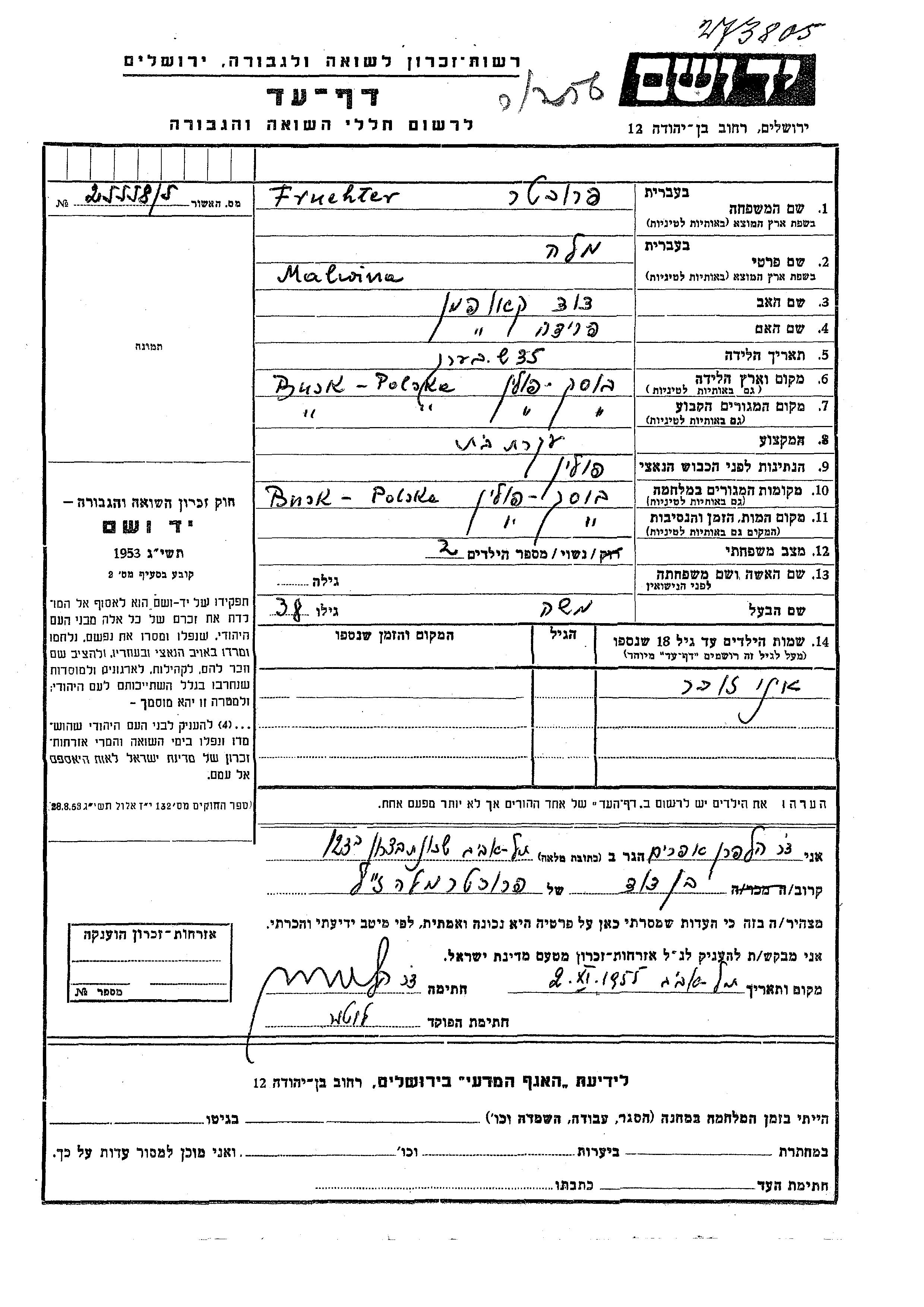 Мальвина Мала Фрухтер, девичья фамилия Кауфман, место рождения: Буск, Польша. Отец: Давид, mать:Фрида. Домохозяйка. Женат / замужем. Место жительства до войны: Буск, Польша. Место во время войны: Буск, Польша.