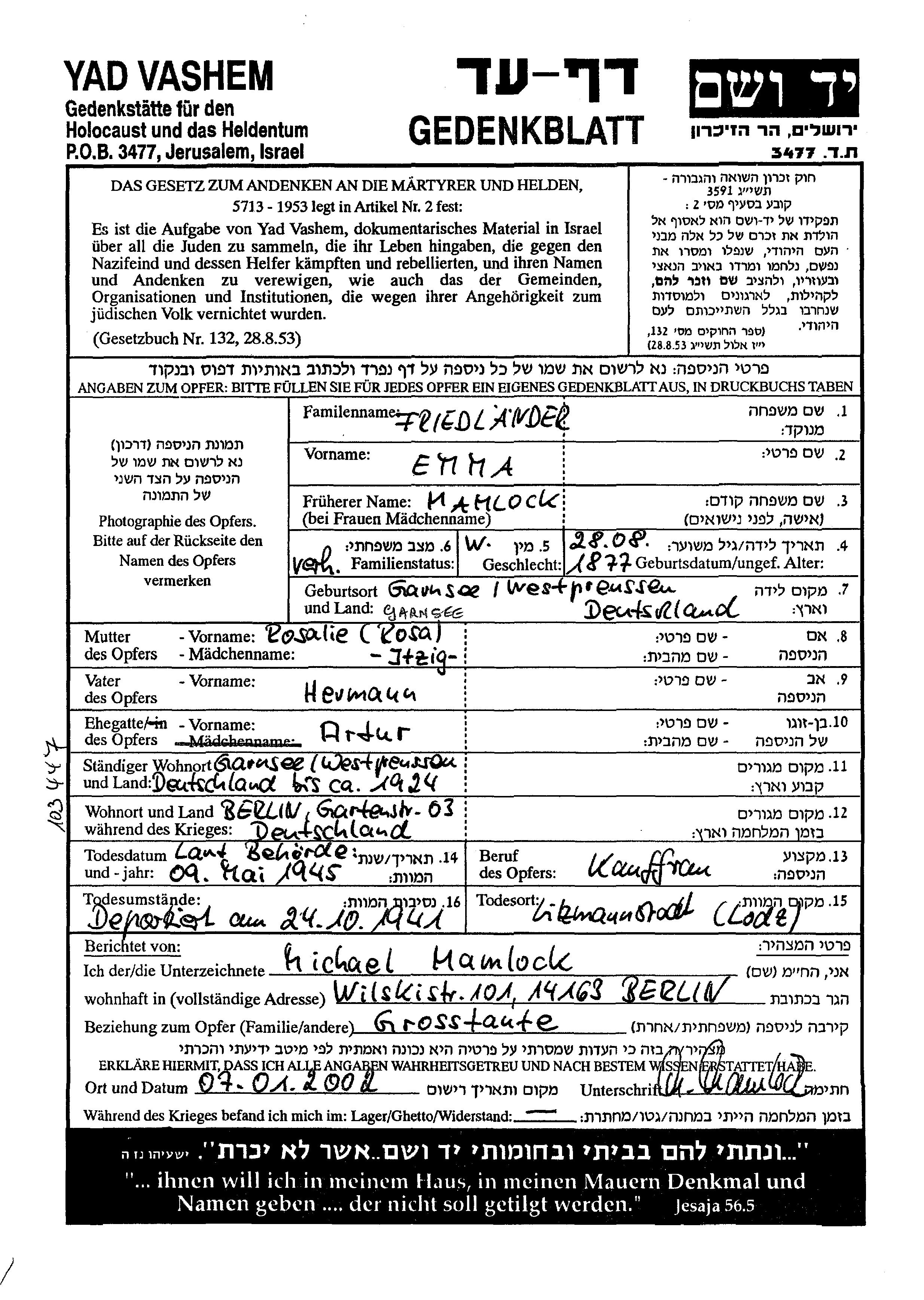 Эмма Фридлендер, девичья фамилия Мамлок, место рождения: Гарнзее, Германия. Отец: Херманн, mать:Розали. Торговец / торговка. Женат / замужем. Место жительства до войны: Гарнзее, Германия. Место во время войны: Берлин, Германия.