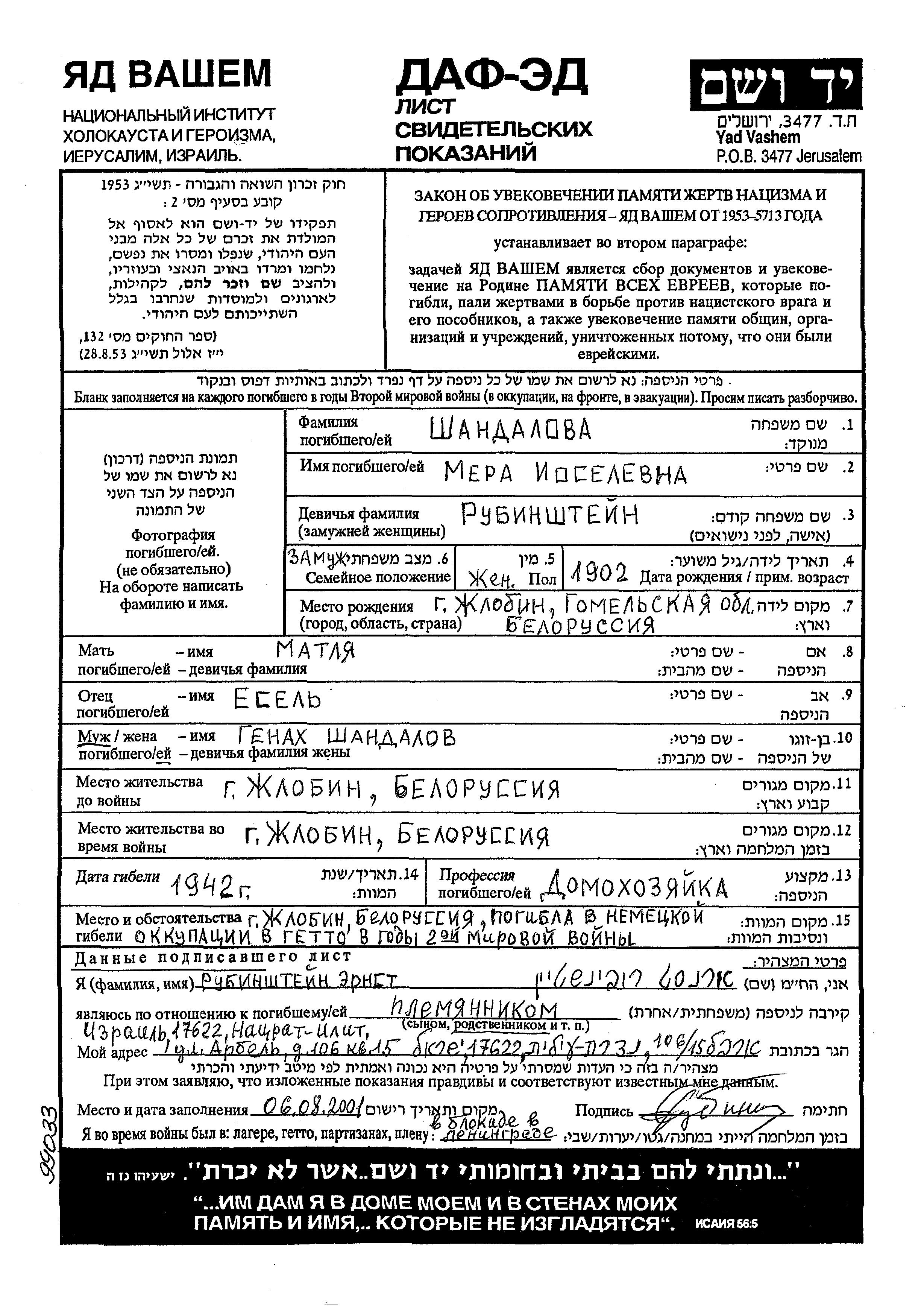 Шандалова Мера 1902 Жлобин, Белоруссия (СССР) Лист свидетельских показаний