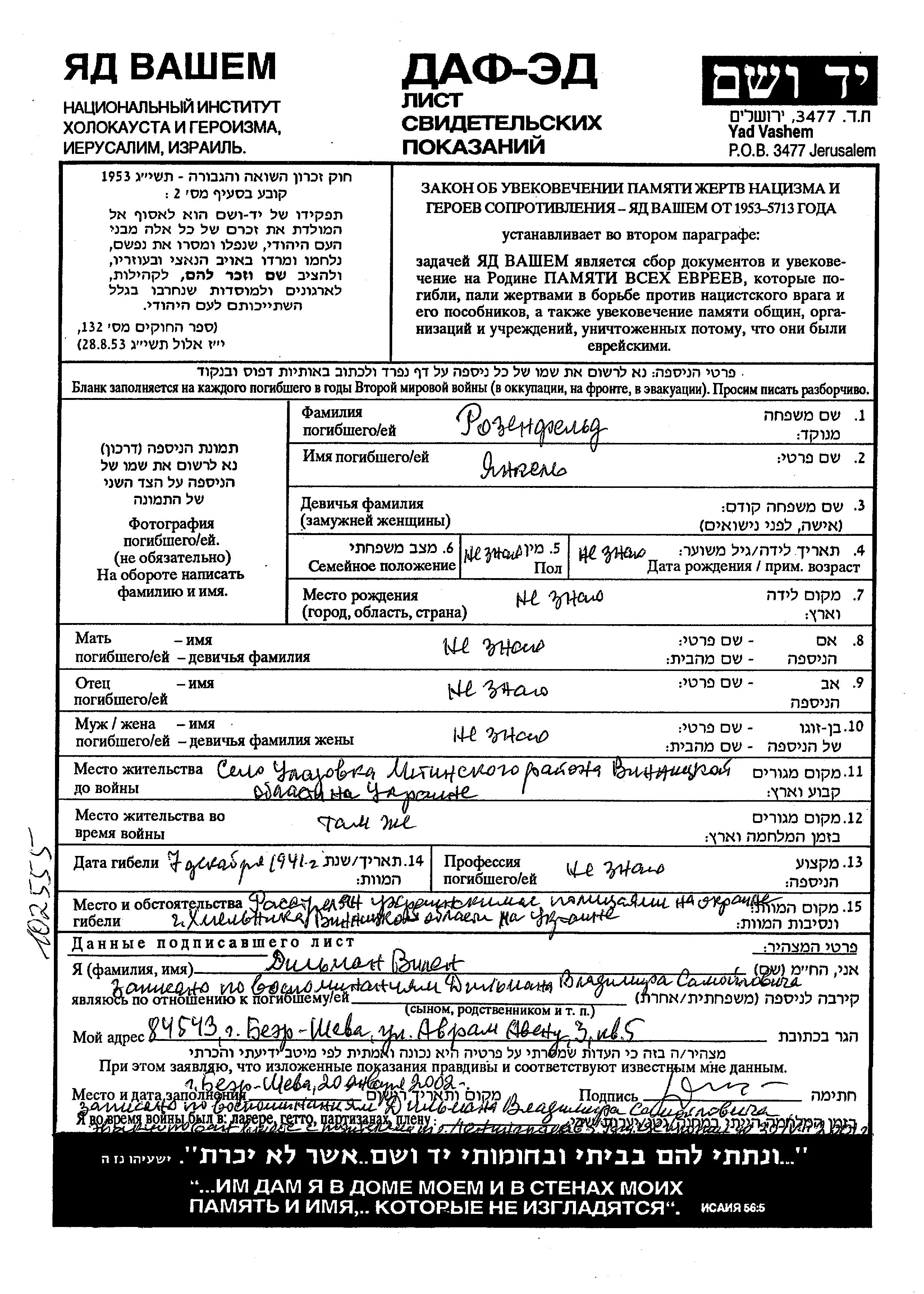 Розенфельд Янкель место не указано, Лист свидетельских показаний