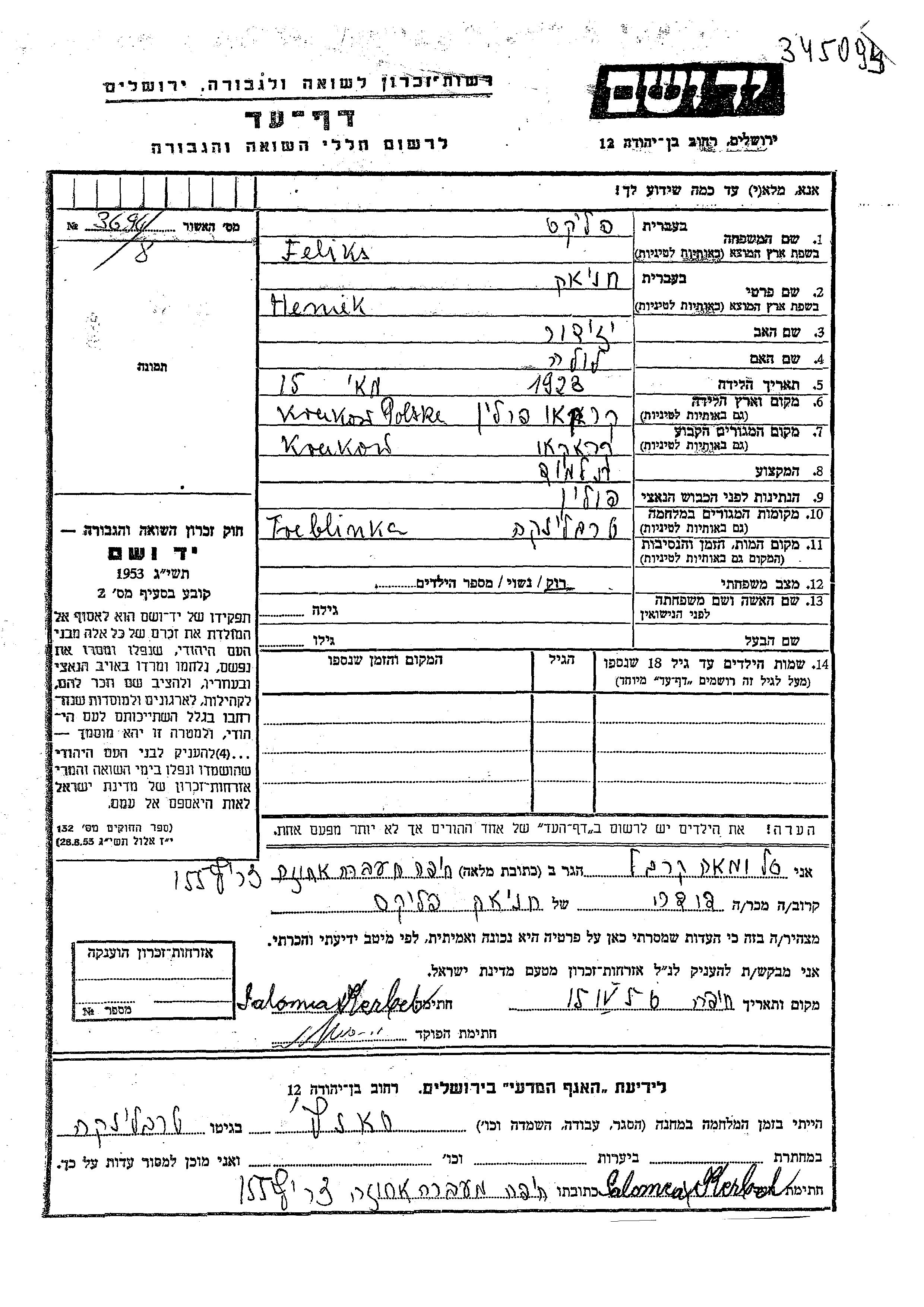 Хеник Феликс, место рождения: Краков, Польша. Отец: Изидор, mать:Лила. Ученик / ученица. Холост / не замужем. Место жительства до войны: Краков, Польша. Место во время войны: Треблинка, Польша.