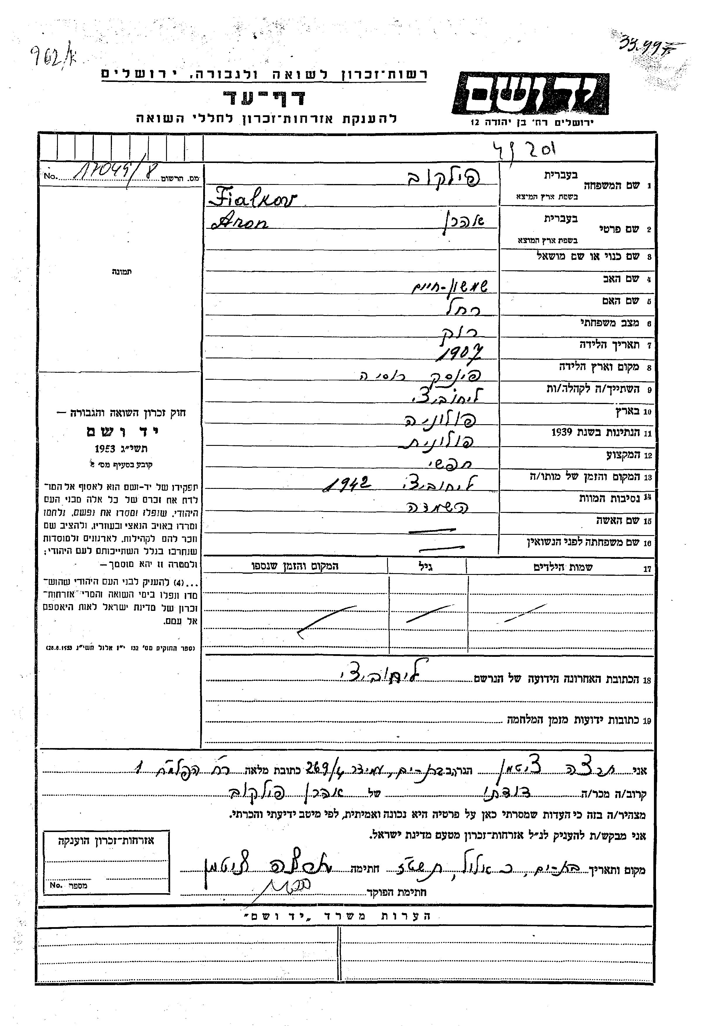 Арон Фиалков Пильков, место рождения: Пинск, Польша. Отец: Шимшон Хаим, mать:Рахель. Лицо свободной профессии. Холост / не замужем. Место жительства до войны: Лохвица, Украина (СССР).