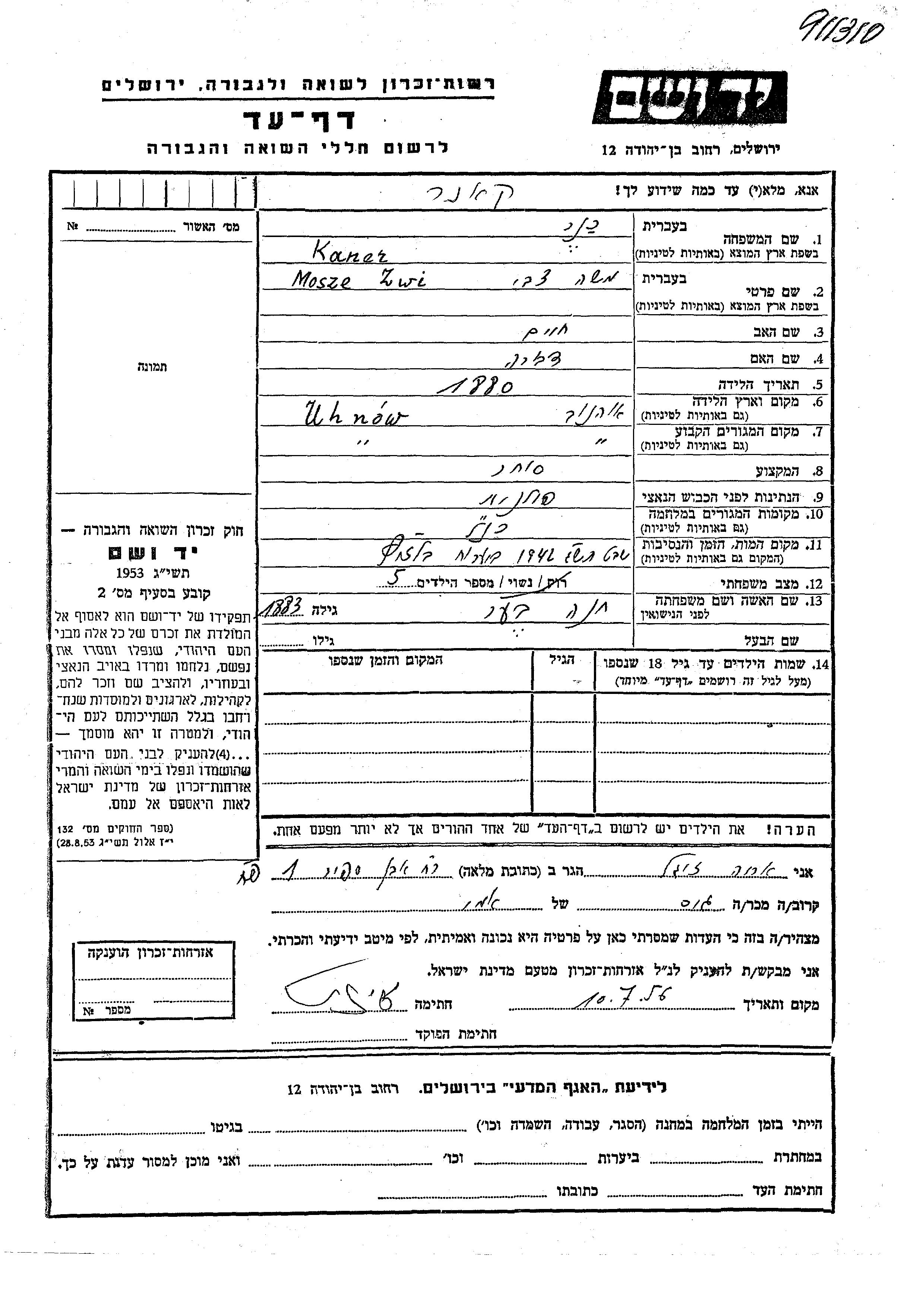 Канер Моше Цви 1880 Угнев, Польша Лист свидетельских показаний