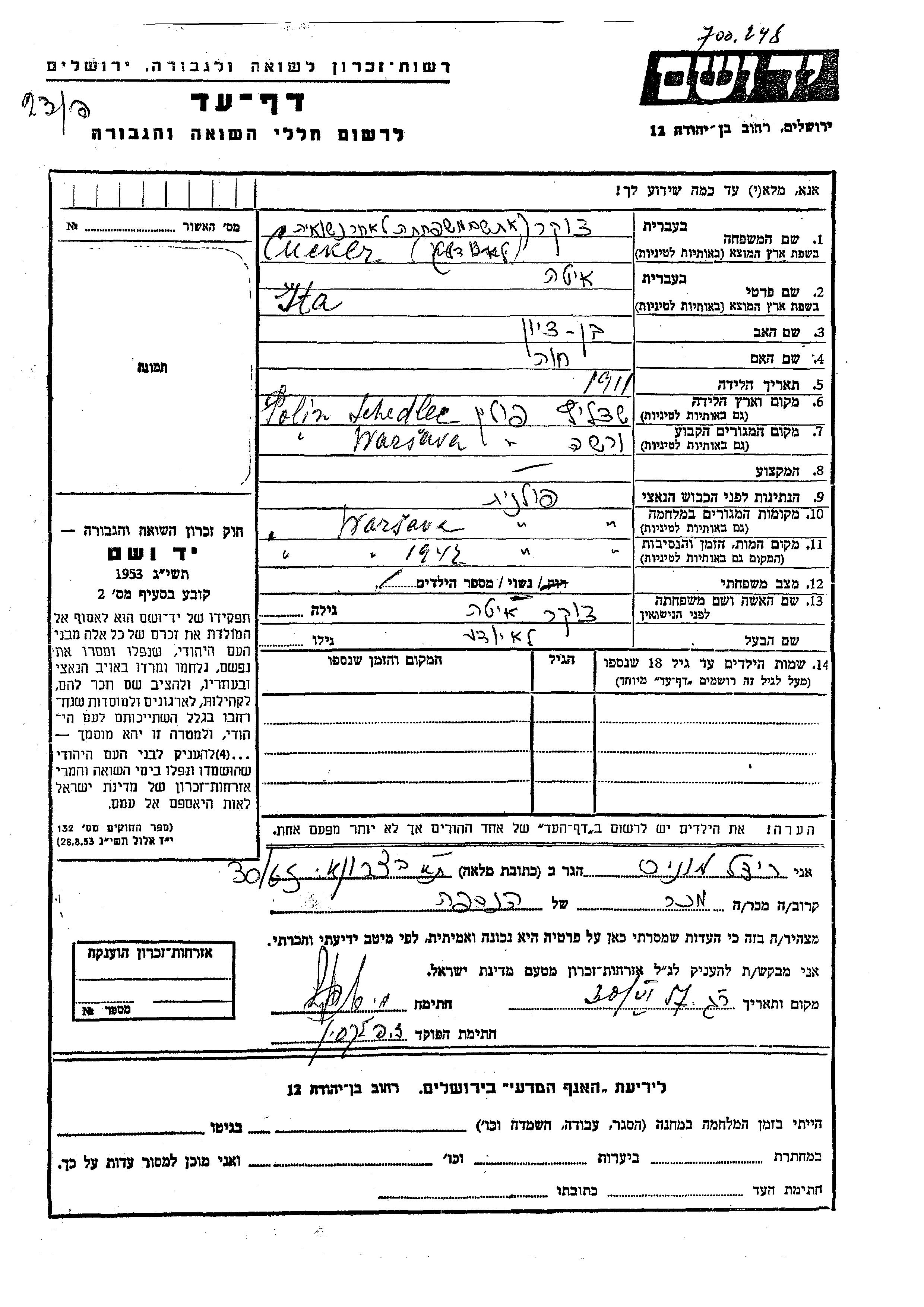 Цукер Ита 1911 Варшава, Польша Лист свидетельских показаний
