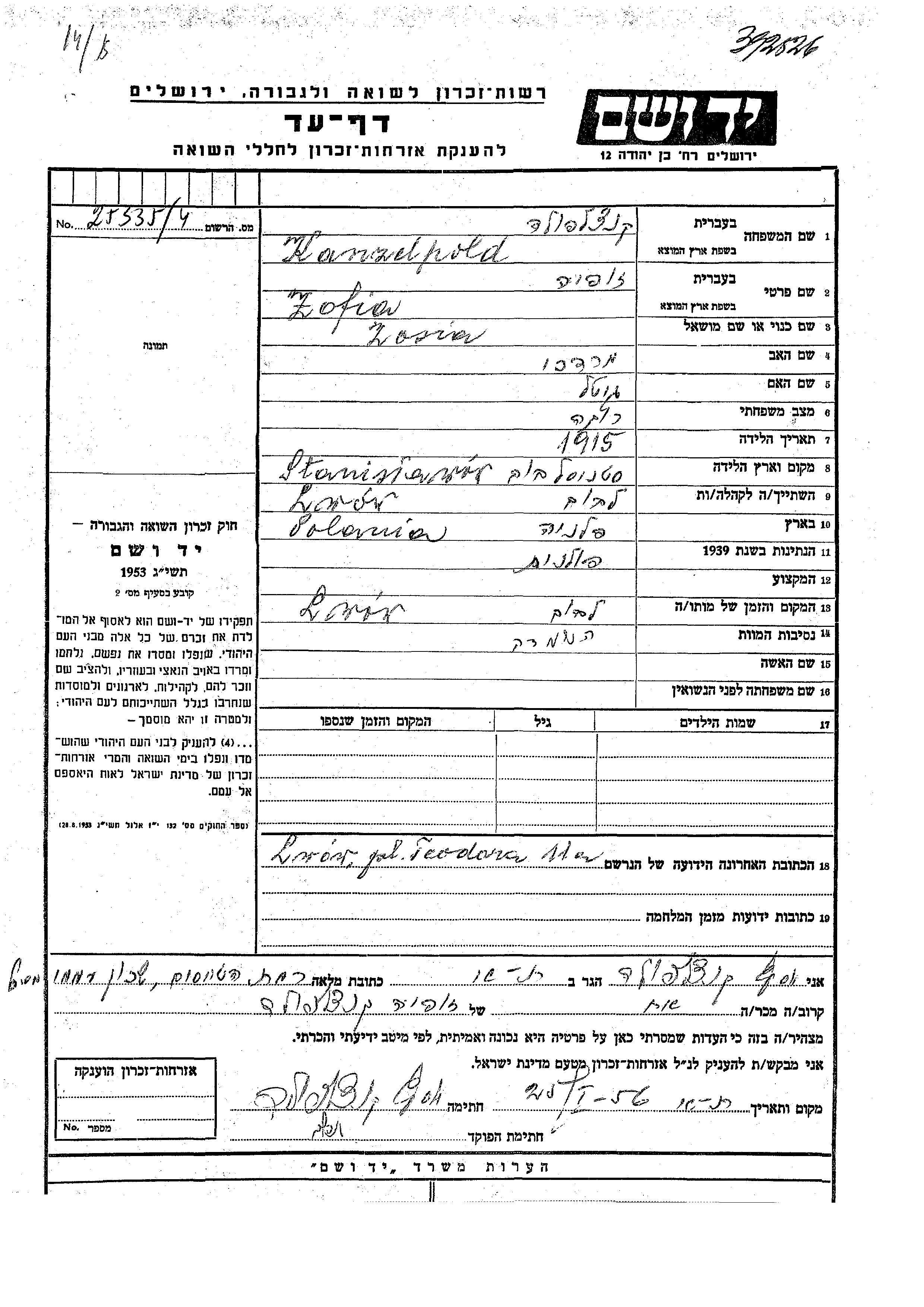 Зофия Канцельпольд, место рождения: Станиславув, Польша. Отец: Мордехай, mать:Гитель. Холост / не замужем. Место жительства до войны: Львов, Польша.