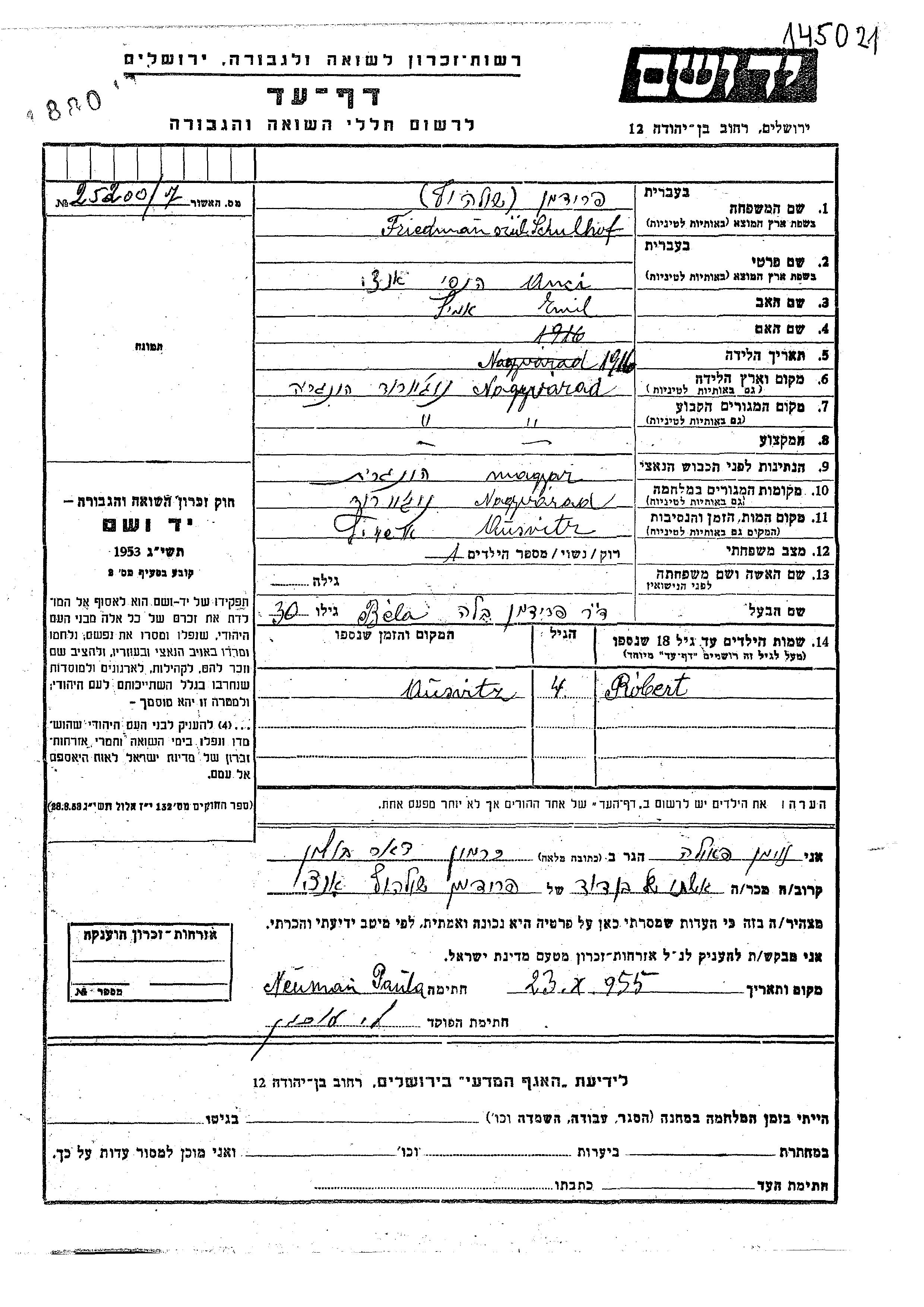 Фридман Шульхоф Анци Ханси 1916 Надьварад, Румыния Лист свидетельских показаний