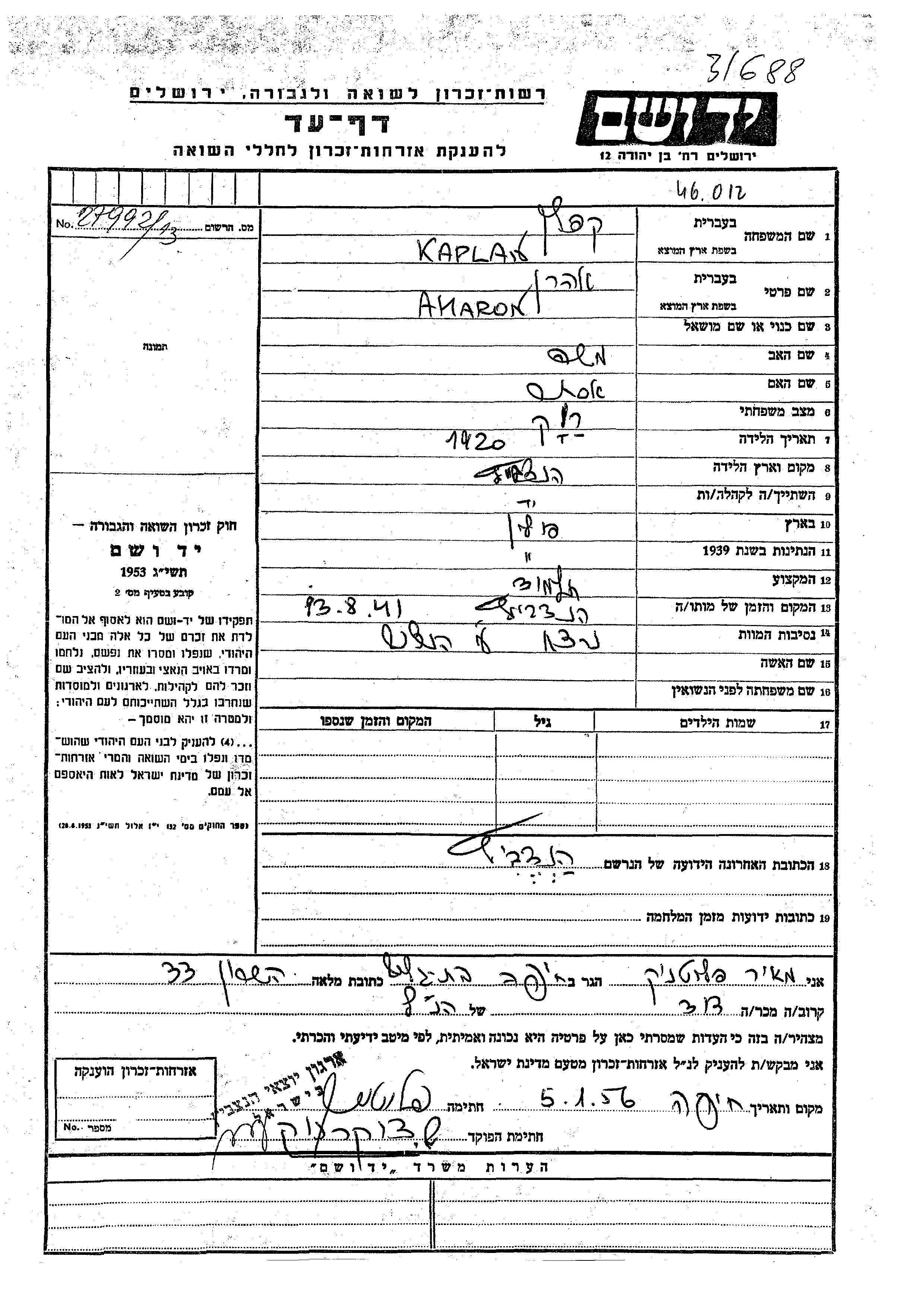 Каплан Арон 1920 Ганцевичи, Польша Лист свидетельских показаний