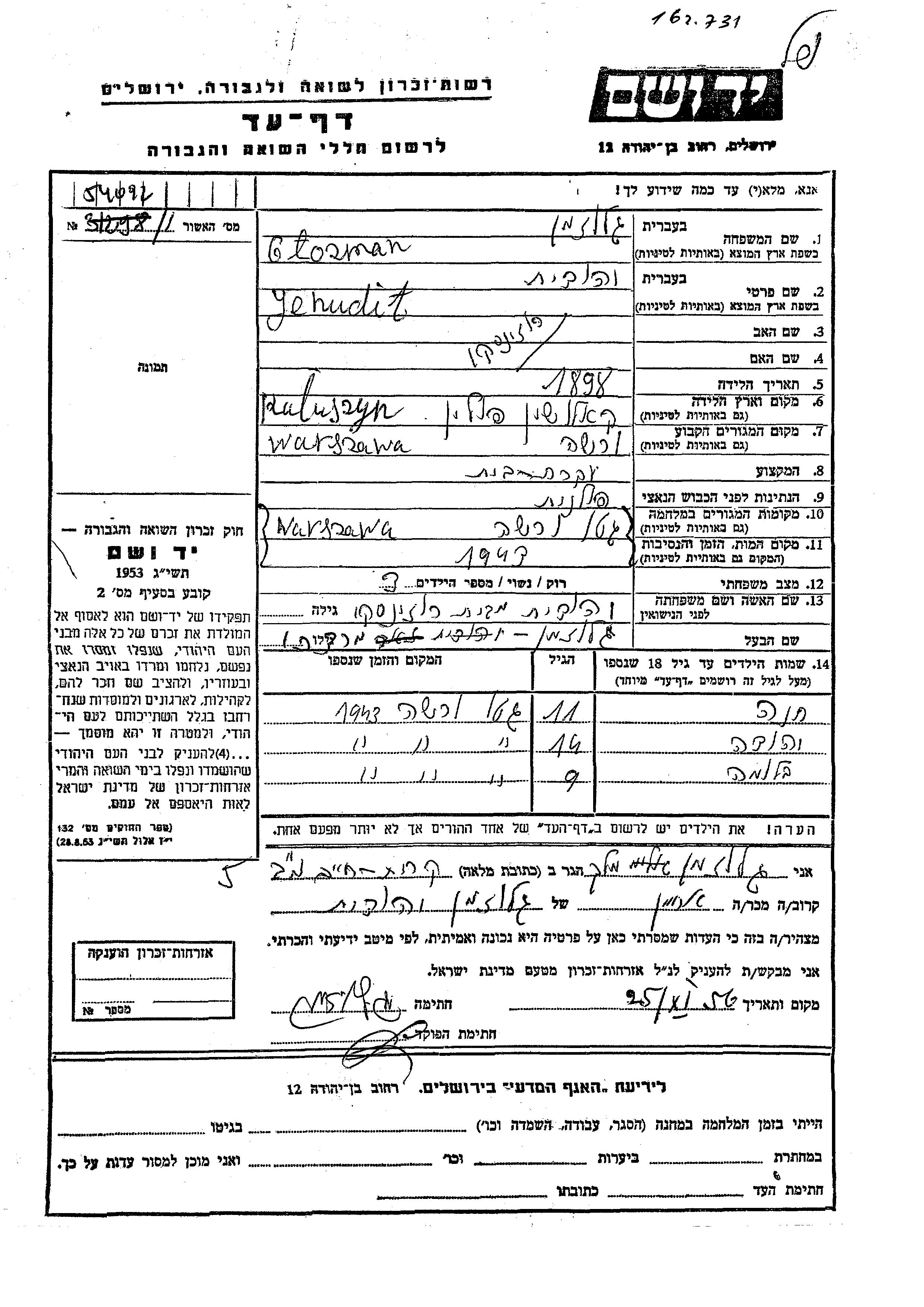Глозман Иегудит 1898 Варшава, Польша Лист свидетельских показаний