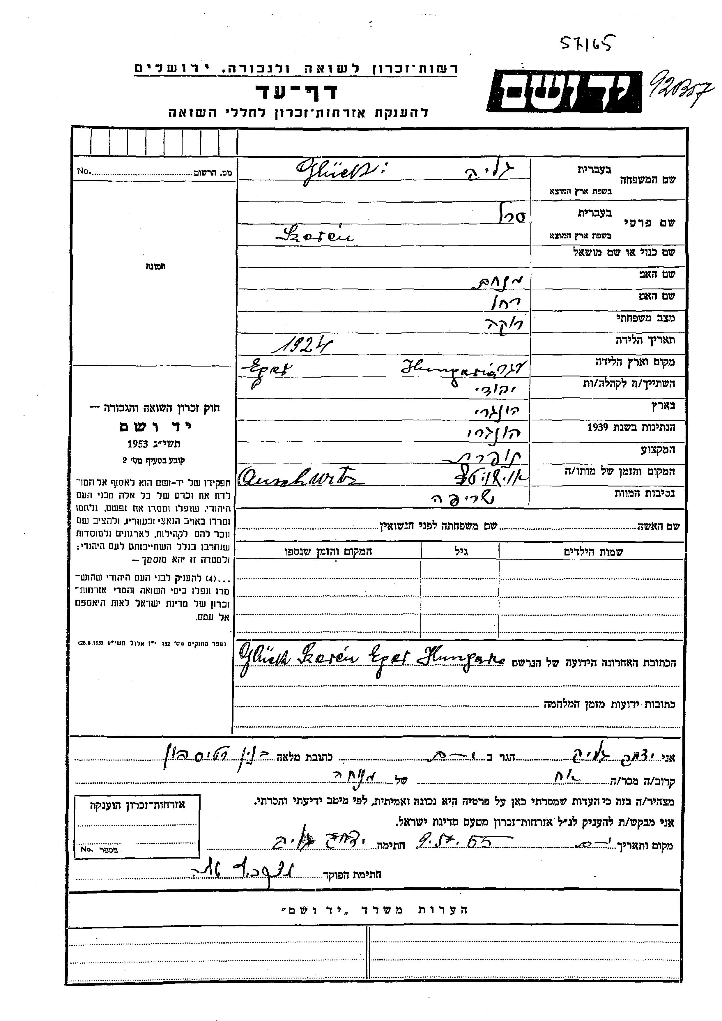 Серен Глюк, место рождения: Эгер, Венгрия. Отец: Менахем, mать:Рахель. Швея. Холост / не замужем. Место жительства до войны: Эгер, Венгрия.
