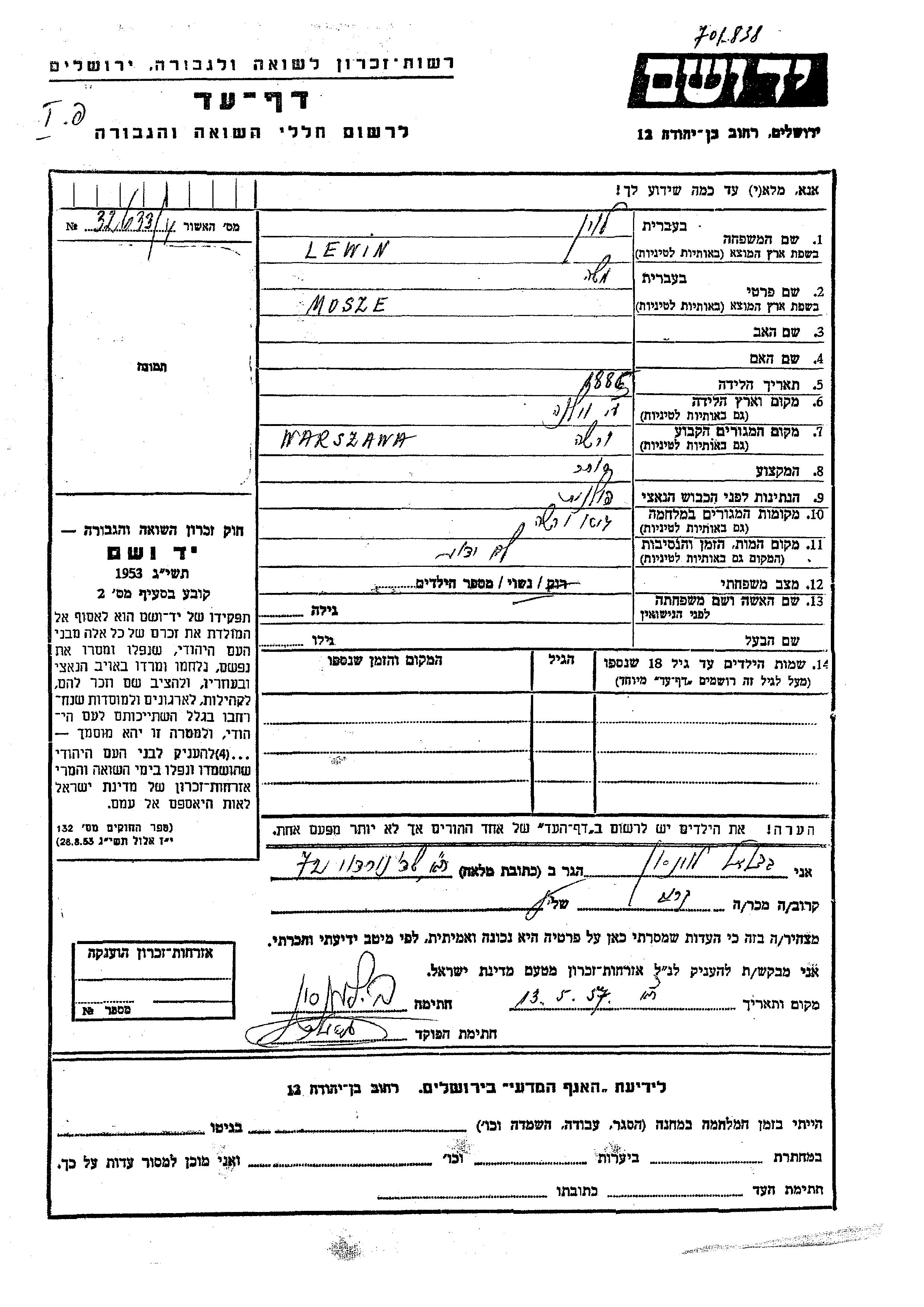 Моше Левин, место рождения: Вильно, Польша. Торговец / торговка. Женат / замужем. Место жительства до войны: Варшава, Польша. Место во время войны: Варшава, Польша.