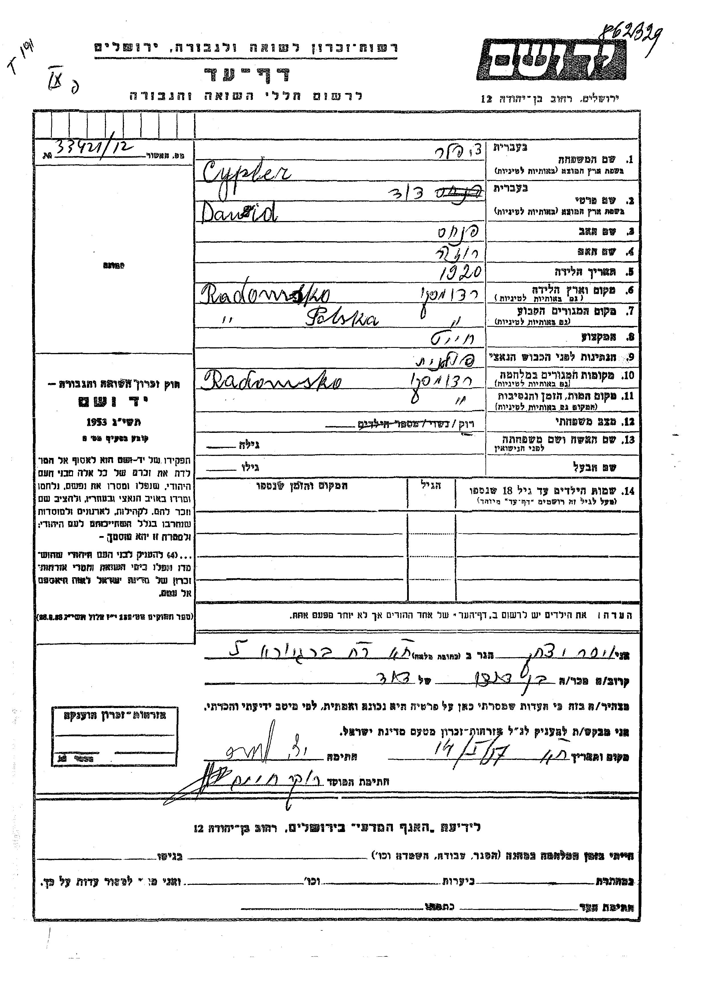 Цыплер Давид 1920 Радомско, Польша Лист свидетельских показаний