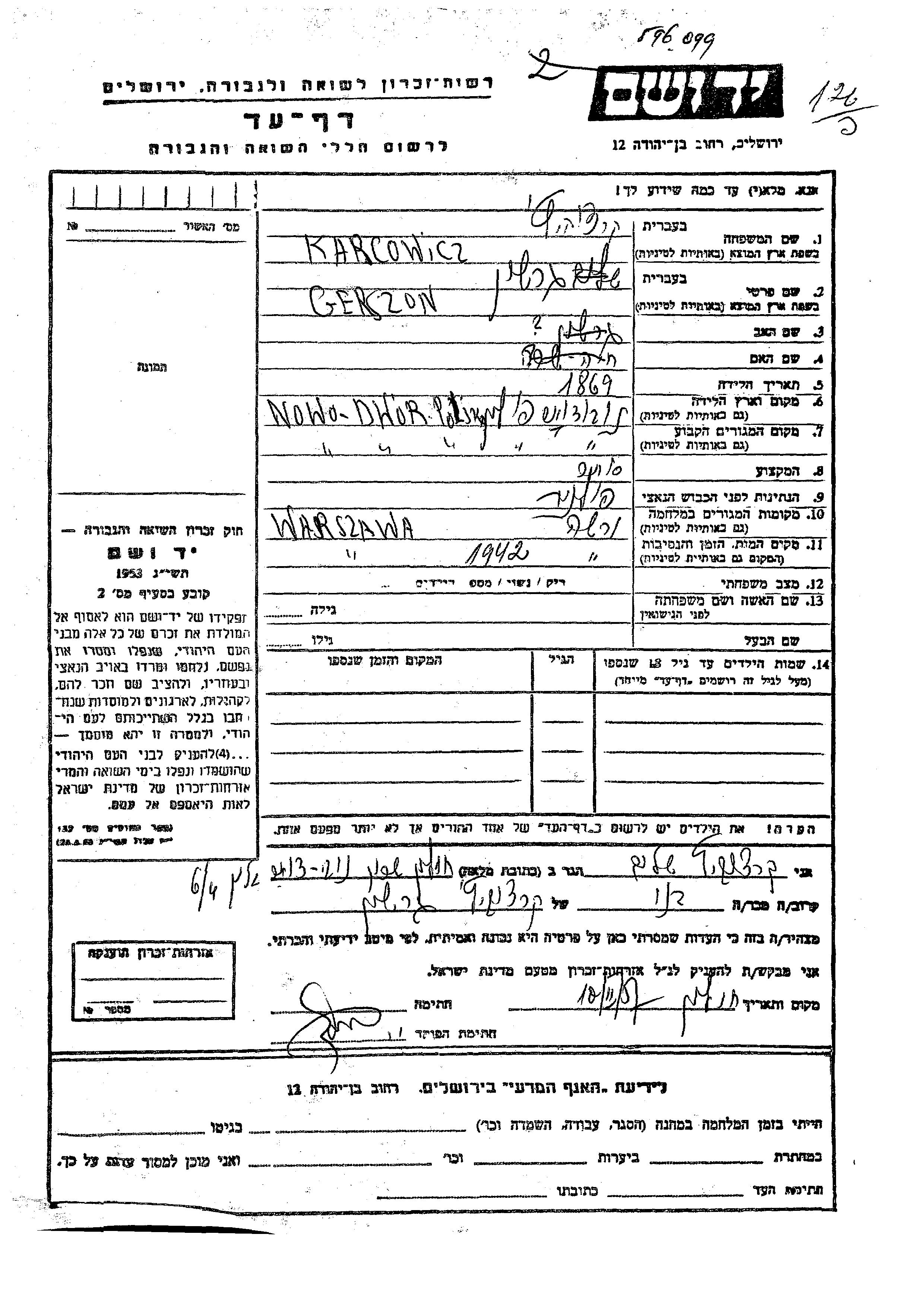 Карцович Гершон 1896 Новы Двор, Польша Лист свидетельских показаний