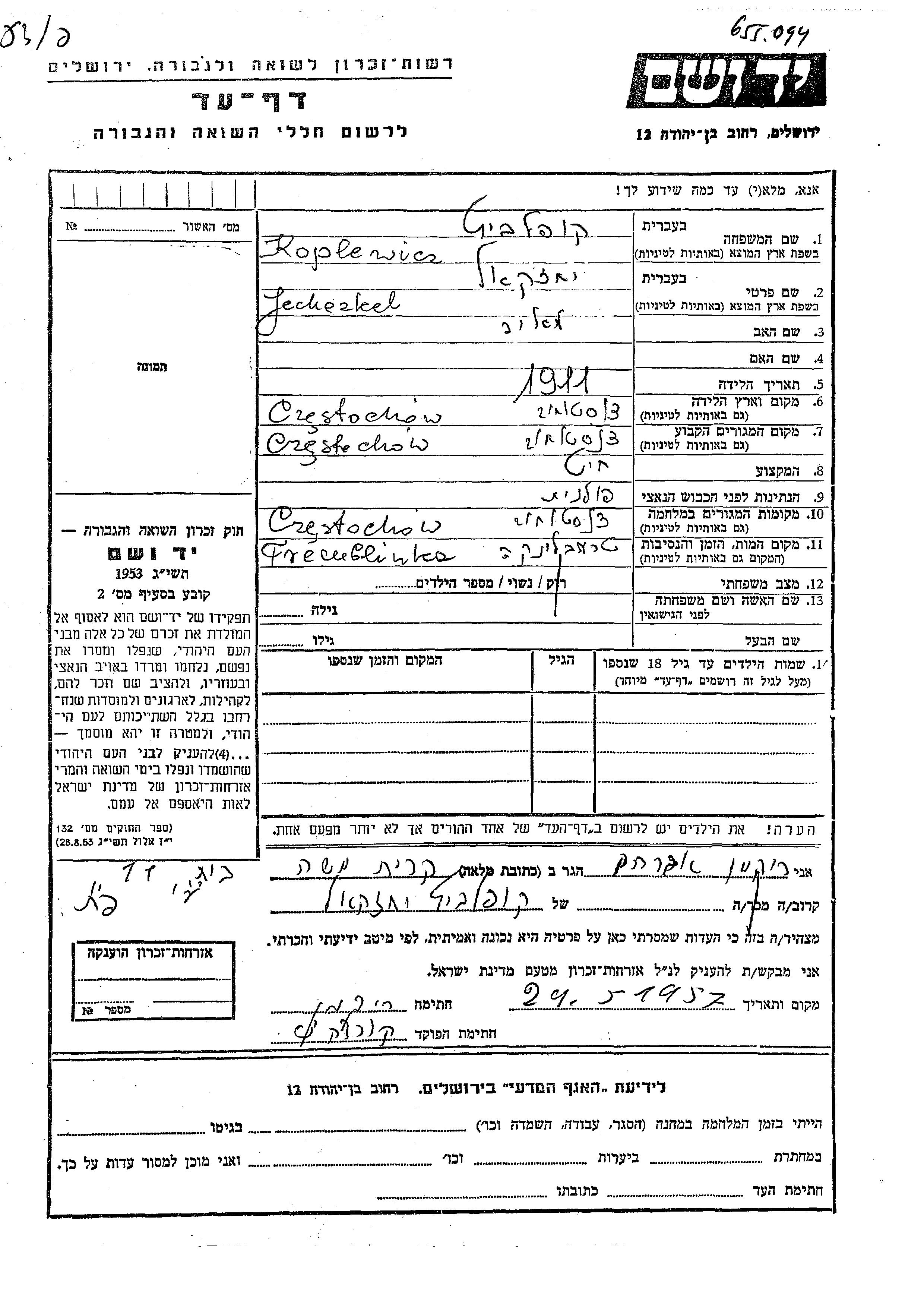 Коплевич Иехезкель 1911 Ченстохов, Польша Лист свидетельских показаний