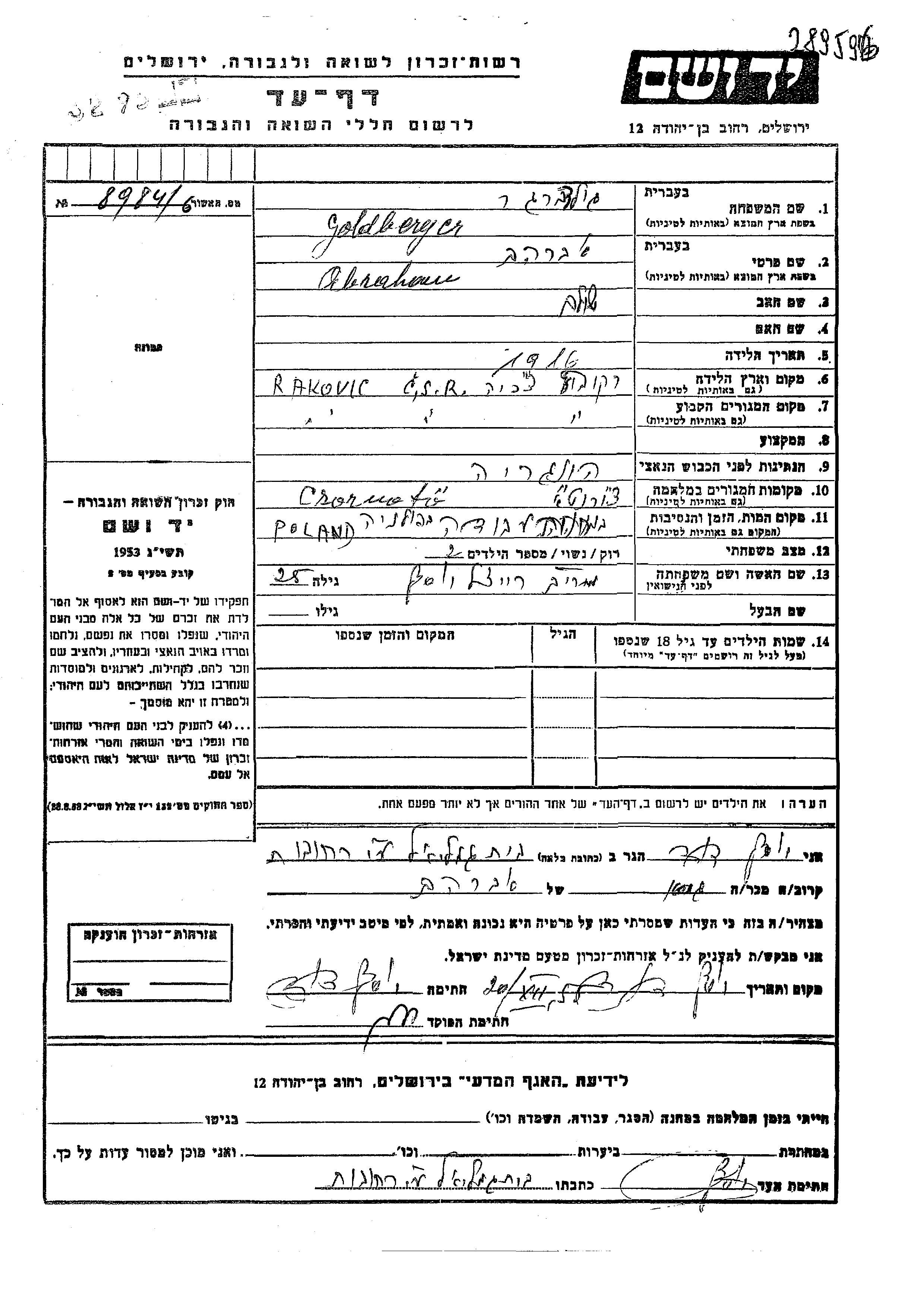 Гольдберг Авраам 1916 Раковице, Чехословакия Лист свидетельских показаний